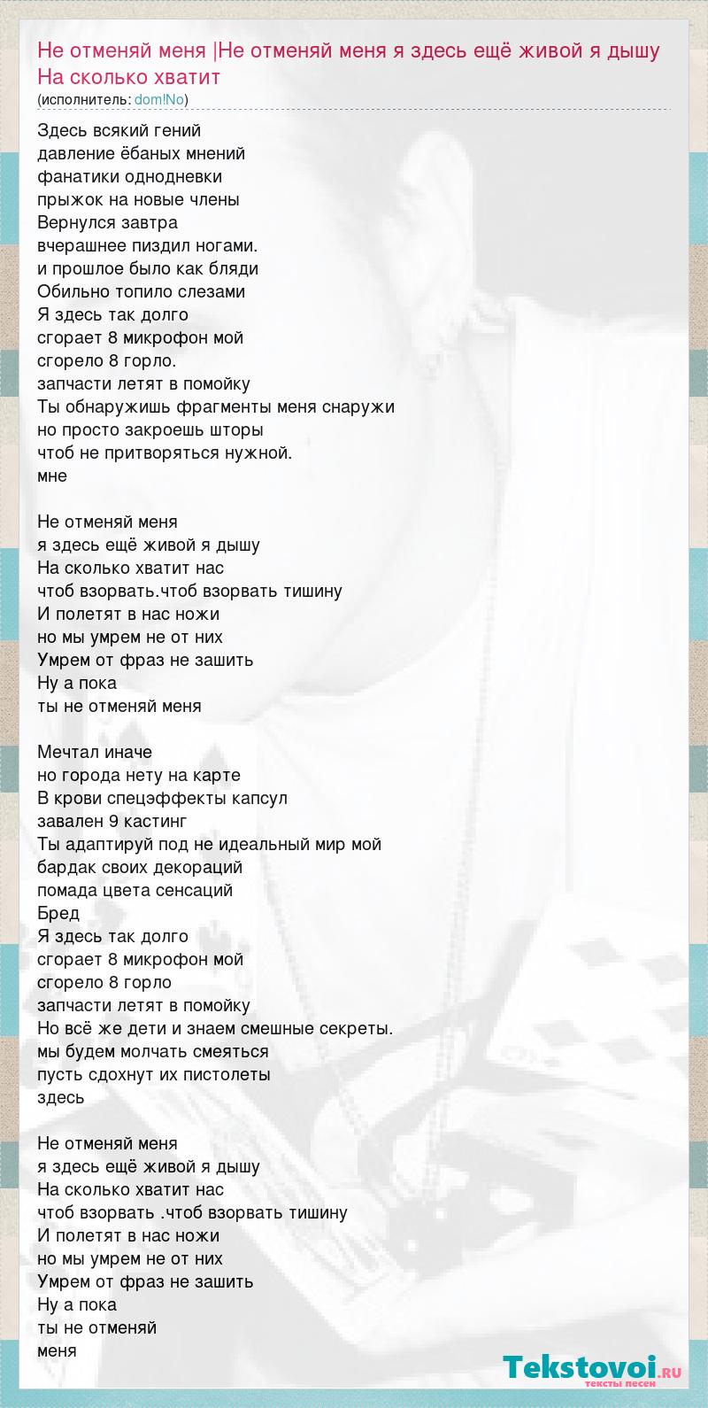 Здесь всякий гений давление ёбаных мнений фанатики однодневки прыжок на новые члены Вернулся завтра вчерашнее пиздил ногами. и прошлое было как бляди Обильно топило слезами Я здесь так долго сгорает 8 микрофон мой сгорело 8 горло. запчасти летят в помойку Ты обнаружишь фрагменты меня снаружи но просто закроешь шторы чтоб не притворяться нужной. мне Не отменяй меня я здесь ещё живой я дышу На сколько хватит нас чтоб взорвать.чтоб взорвать тишину И полетят в нас ножи но мы умрем не от них Умрем от фраз не зашить Ну а пока ты не отменяй меня Мечтал иначе но города нету на карте В крови спецэффекты капсул завален 9 кастинг Ты адаптируй под не идеальный мир мой бардак своих декораций помада цвета сенсаций Бред Я здесь так долго сгорает 8 микрофон мой сгорело 8 горло запчасти летят в помойку Но всё же дети и знаем смешные секреты. мы будем молчать смеяться пусть сдохнут их пистолеты здесь Не отменяй меня я здесь ещё живой я дышу На сколько хватит нас чтоб взорвать .чтоб взорвать тишину И полетят в нас ножи но мы умрем не от них Умрем от фраз не зашить Ну а пока ты не отменяй меня