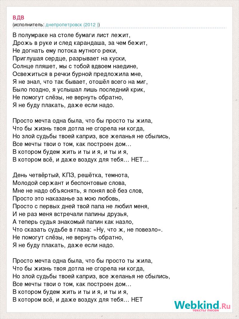 В полумраке на столе бумаги лист лежит, Дрожь в руке и след карандаша, за чем бежит, Не догнать ему потока мутного реки, Приглушая сердце, разрывает на куски, Солнце пляшет, мы с тобой вдвоем наедине, Освежиться в речки бурной предложила мне, Я не знал, что так бывает, отошёл всего на миг, Было поздно, я услышал лишь последний крик, Не помогут слёзы, не вернуть обратно, Я не буду плакать, даже если надо. Просто мечта одна была, что бы просто ты жила, Что бы жизнь твоя дотла не сгорела ни когда, Но злой судьбы твоей каприз, все желанья не сбылись, Все мечты твои о том, как построен дом… В котором будем жить и ты и я, и ты и я, В котором всё, и даже воздух для тебя… НЕТ… День четвёртый, КПЗ, решётка, темнота, Молодой сержант и беспонтовые слова, Мне не надо объяснять, я понял всё без слов, Просто это наказанье за мою любовь, Просто с первых дней твой папа не любил меня, И не раз меня встречали папины друзья, А теперь судья знакомый папин как назло, Что сказать судьбе в глаза: «Ну, что ж, не повезло». Не помогут слёзы, не вернуть обратно, Я не буду плакать, даже если надо. Просто мечта одна была, что бы просто ты жила, Что бы жизнь твоя дотла не сгорела ни когда, Но злой судьбы твоей каприз, все желанья не сбылись, Все мечты твои о том, как построен дом… В котором будем жить и ты и я, и ты и я, В котором всё, и даже воздух для тебя… НЕТ