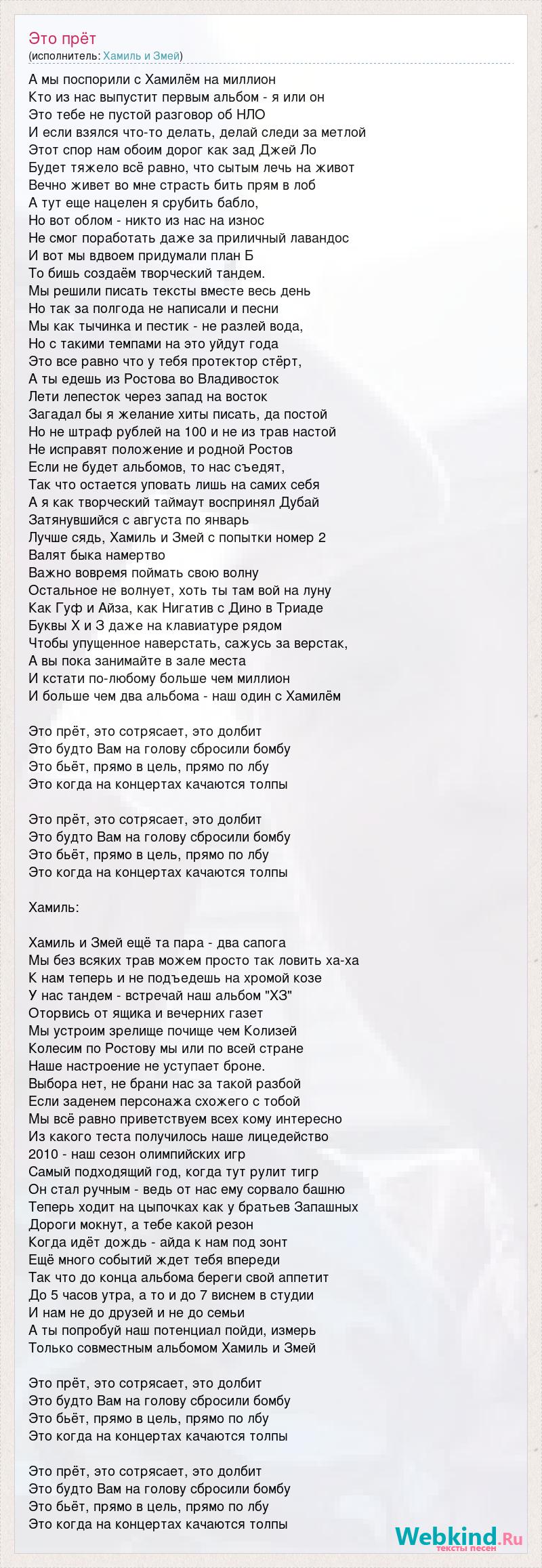 А мы поспорили с Хамилём на миллион Кто из нас выпустит первым альбом - я или он Это тебе не пустой разговор об НЛО И если взялся что-то делать, делай следи за метлой Этот спор нам обоим дорог как зад Джей Ло Будет тяжело всё равно, что сытым лечь на живот Вечно живет во мне страсть бить прям в лоб А тут еще нацелен я срубить бабло, Но вот облом - никто из нас на износ Не смог поработать даже за приличный лавандос И вот мы вдвоем придумали план Б То бишь создаём творческий тандем. Мы решили писать тексты вместе весь день Но так за полгода не написали и песни Мы как тычинка и пестик - не разлей вода, Но с такими темпами на это уйдут года Это все равно что у тебя протектор стёрт, А ты едешь из Ростова во Владивосток Лети лепесток через запад на восток Загадал бы я желание хиты писать, да постой Но не штраф рублей на 100 и не из трав настой Не исправят положение и родной Ростов Если не будет альбомов, то нас съедят, Так что остается уповать лишь на самих себя А я как творческий таймаут воспринял Дубай Затянувшийся с августа по январь Лучше сядь, Хамиль и Змей с попытки номер 2 Валят быка намертво Важно вовремя поймать свою волну Остальное не волнует, хоть ты там вой на луну Как Гуф и Айза, как Нигатив с Дино в Триаде Буквы Х и З даже на клавиатуре рядом Чтобы упущенное наверстать, сажусь за верстак, А вы пока занимайте в зале места И кстати по-любому больше чем миллион И больше чем два альбома - наш один с Хамилём Это прёт, это сотрясает, это долбит Это будто Вам на голову сбросили бомбу Это бьёт, прямо в цель, прямо по лбу Это когда на концертах качаются толпы Это прёт, это сотрясает, это долбит Это будто Вам на голову сбросили бомбу Это бьёт, прямо в цель, прямо по лбу Это когда на концертах качаются толпы Хамиль: Хамиль и Змей ещё та пара - два сапога Мы без всяких трав можем просто так ловить ха-ха К нам теперь и не подъедешь на хромой козе У нас тандем - встречай наш альбом "ХЗ" Оторвись от ящика и вечерних газет Мы устроим зрелище почище чем Колизей Колесим по Ростову мы или по всей стране Наше настроение не уступает броне. Выбора нет, не брани нас за такой разбой Если заденем персонажа схожего с тобой Мы всё равно приветствуем всех кому интересно Из какого теста получилось наше лицедейство 2010 - наш сезон олимпийских игр Самый подходящий год, когда тут рулит тигр Он стал ручным - ведь от нас ему сорвало башню Теперь ходит на цыпочках как у братьев Запашных Дороги мокнут, а тебе какой резон Когда идёт дождь - айда к нам под зонт Ещё много событий ждет тебя впереди Так что до конца альбома береги свой аппетит До 5 часов утра, а то и до 7 виснем в студии И нам не до друзей и не до семьи А ты попробуй наш потенциал пойди, измерь Только совместным альбомом Хамиль и Змей Это прёт, это сотрясает, это долбит Это будто Вам на голову сбросили бомбу Это бьёт, прямо в цель, прямо по лбу Это когда на концертах качаются толпы Это прёт, это сотрясает, это долбит Это будто Вам на голову сбросили бомбу Это бьёт, прямо в цель, прямо по лбу Это когда на концертах качаются толпы