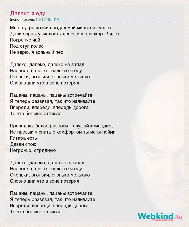 Мне с утра хозяин выдал мой мирской туалет Дали справку, малость денег и в плацкарт билет Покрепче чай Под стук колес Не верю, я вольный пес Далеко, далеко, далеко на запад Налегке, налегке, налегке я еду Огоньки, огоньки, огоньки мелькают Словно дни что в зоне потерял Пацаны, пацаны, пацаны встречайте Я теперь развязал, так что наливайте Впереди, впереди, впереди дорога То что бог мне отписал Проводник белье разносит: слушай командир, Не привык я спать с комфортом ты меня пойми Гитара есть Давай спою Негромко, отрядную Далеко, далеко, далеко на запад Налегке, налегке, налегке я еду Огоньки, огоньки, огоньки мелькают Словно дни что в зоне потерял Пацаны, пацаны, пацаны встречайте Я теперь развязал, так что наливайте Впереди, впереди, впереди дорога То что бог мне отписал
