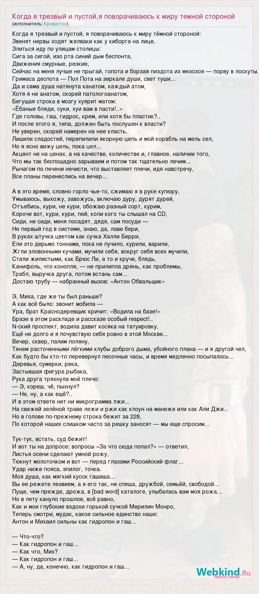 Когда я трезвый и пустой, я поворачиваюсь к миру тёмной стороной: Звенят нервы ходят желваки как у киборга на лице, Злиться иду по улицам столицы: Сига за сигой, изо рта синий дым беспонта, Движения смурные, резкие, Сейчас на меня лучше не прыгай, гопота и борзая пиздота из мезозоя — порву в лоскуты. Гримаса деспота — Пол Пота на зеркале души, свет туши... Да и сама душа натянута канатом, каждый атом, Хотя я не анатом, скорей патологоанатом, Бегущая строка в мозгу хуярит матом: «Ёбаные бляди, суки, хуи вам в пасти!..» Где головы, гаш, гидрос, крем, или хотя бы пластик?.. И после этого я, типа, должен быть послушен к власти? Не уверен, скорей намерен на нее класть. Лишили сладостей, перепилили якорную цепь и мой корабль на мель сел, Но я ясно вижу цель, пока цел... Акцент не на ценах, а на качестве, количестве и, главное, наличии того, Что мы так беспощадно зарываем и потом так тщательно лечим... Рычагом по печени нечисти, что выставляет плечи, идя навстречу, Все планы перенеслись на вечер... А в это время, словно горло чье-то, сжимаю я в руке купюру, Умываюсь, выхожу, завожусь, включаю дуру, дурят дурей, Отъебись, кури, не кури, обожаю разный сорт, курим, Короче вот, кури, кури, пей, коли кого ты слышал на CD, Сиди, не сиди, меня посадят, дядя, сам посуди — Не первый год в системе, знаю, да, лаве бери, В руках штучка цветом как сучка Халли Берри, Ели это дерьмо тоннами, пока не пучило, курили, варили, Жгли зловонными кучами, мучили себя, вокруг себя всех мучили, Стали жилистыми, как Брюс Ли, а то и круче, блядь, Канифоль, что конопля, — не прилипла дрянь, как проблемы, Трабл, выручка друга, потом встань сам... Достаю трубу — набранный вызов: «Антон Обвальщик» Э, Миха, где же ты был раньше? А как всё было: звонит мобила — Ура, брат Краснодеревщик кричит: «Водила на базе!» Бразе в этом раскладе и рассказе особый respect!.. N-ский проспект, водила давит косяка на татуировку, Ещё не долго и я почувствую себя ровно в этой Москве... Вечер, сквер, палим поляну, Тянем расточенными лёгкими клубы доброго дыма, убойного плана — и я другой чел, Как будто бы кто-то перевернул песочные часы, и время медленно посыпалось... Деревья, сумерки, река, Застывшая фигура рыбака, Рука друга тряхнула моё плечо: — Э, кореш, чё, пыхнул? — Не, ну, а как ещё?.. И в этом ответе нет ни микрограмма лжи... На свежей зелёной траве лежи и ржи как клоун на манеже или как Али Джи... Но в голове по-прежнему строка бежит за 228, По которой наших слишком часто за решку заносят — мы еще спросим... Тук-тук, встать, суд бежит! И вот ты на допросе: вопросы «За что сюда попал?» — ответил, Листья осени сделают умной рожу, Тюкнут молоточком и вот — перед глазами Российский флаг... Удар ниже пояса, эпилог, точка. Моя душа, как мягкий кусок гашиша... Вы ее режете лезвием, а я его так, не спеша, дружбой, семьёй, свободой... Пуще, чем прежде, дрожа, в [bad word] каталоге, улыбалась вам моя рожа... Но в лету кануло прошлое, всё равно, Как и мои глубокие вздохи горькой сучкой Мерилин Монро, Теперь смотри, мудак, какое сильное единство наше: Антон и Михаил сильны как гидропон и гаш... — Что-что? — Как гидропон и гаш... — Как что, Мих? — Как гидропон и гаш... — А, ну, да, конечно, как гидропон и гаш...