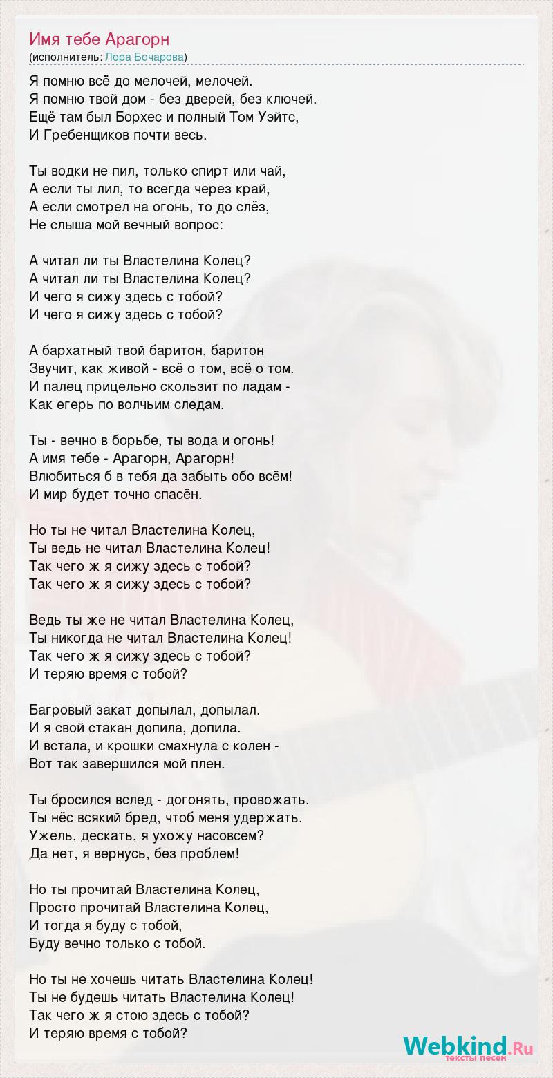 Я помню всё до мелочей, мелочей. Я помню твой дом - без дверей, без ключей. Ещё там был Борхес и полный Том Уэйтс, И Гребенщиков почти весь. Ты водки не пил, только спирт или чай, А если ты лил, то всегда через край, А если смотрел на огонь, то до слёз, Не слыша мой вечный вопрос: А читал ли ты Властелина Колец? А читал ли ты Властелина Колец? И чего я сижу здесь с тобой? И чего я сижу здесь с тобой? А бархатный твой баритон, баритон Звучит, как живой - всё о том, всё о том. И палец прицельно скользит по ладам - Как егерь по волчьим следам. Ты - вечно в борьбе, ты вода и огонь! А имя тебе - Арагорн, Арагорн! Влюбиться б в тебя да забыть обо всём! И мир будет точно спасён. Но ты не читал Властелина Колец, Ты ведь не читал Властелина Колец! Так чего ж я сижу здесь с тобой? Так чего ж я сижу здесь с тобой? Ведь ты же не читал Властелина Колец, Ты никогда не читал Властелина Колец! Так чего ж я сижу здесь с тобой? И теряю время с тобой? Багровый закат допылал, допылал. И я свой стакан допила, допила. И встала, и крошки смахнула с колен - Вот так завершился мой плен. Ты бросился вслед - догонять, провожать. Ты нёс всякий бред, чтоб меня удержать. Ужель, дескать, я ухожу насовсем? Да нет, я вернусь, без проблем! Но ты прочитай Властелина Колец, Просто прочитай Властелина Колец, И тогда я буду с тобой, Буду вечно только с тобой. Но ты не хочешь читать Властелина Колец! Ты не будешь читать Властелина Колец! Так чего ж я стою здесь с тобой? И теряю время с тобой?