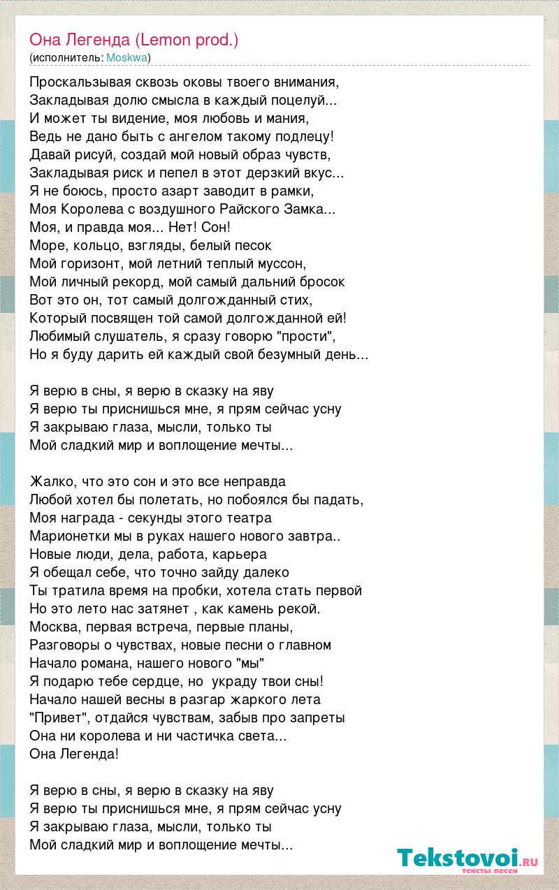 Проскальзывая сквозь оковы твоего внимания, Закладывая долю смысла в каждый поцелуй... И может ты видение, моя любовь и мания, Ведь не дано быть с ангелом такому подлецу! Давай рисуй, создай мой новый образ чувств, Закладывая риск и пепел в этот дерзкий вкус... Я не боюсь, просто азарт заводит в рамки, Моя Королева с воздушного Райского Замка... Моя, и правда моя... Нет! Сон! Море, кольцо, взгляды, белый песок Мой горизонт, мой летний теплый муссон, Мой личный рекорд, мой самый дальний бросок Вот это он, тот самый долгожданный стих, Который посвящен той самой долгожданной ей! Любимый слушатель, я сразу говорю "прости", Но я буду дарить ей каждый свой безумный день... Я верю в сны, я верю в сказку на яву Я верю ты приснишься мне, я прям сейчас усну Я закрываю глаза, мысли, только ты Мой сладкий мир и воплощение мечты... Жалко, что это сон и это все неправда Любой хотел бы полетать, но побоялся бы падать, Моя награда - секунды этого театра Марионетки мы в руках нашего нового завтра.. Новые люди, дела, работа, карьера Я обещал себе, что точно зайду далеко Ты тратила время на пробки, хотела стать первой Но это лето нас затянет , как камень рекой. Москва, первая встреча, первые планы, Разговоры о чувствах, новые песни о главном Начало романа, нашего нового "мы" Я подарю тебе сердце, но украду твои сны! Начало нашей весны в разгар жаркого лета "Привет", отдайся чувствам, забыв про запреты Она ни королева и ни частичка света... Она Легенда! Я верю в сны, я верю в сказку на яву Я верю ты приснишься мне, я прям сейчас усну Я закрываю глаза, мысли, только ты Мой сладкий мир и воплощение мечты...