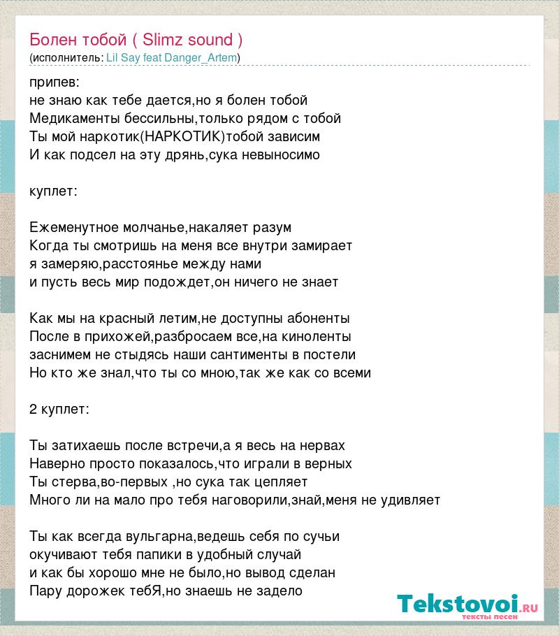 припев: не знаю как тебе дается,но я болен тобой Медикаменты бессильны,только рядом с тобой Ты мой наркотик(НАРКОТИК)тобой зависим И как подсел на эту дрянь,сука невыносимо куплет: Ежеменутное молчанье,накаляет разум Когда ты смотришь на меня все внутри замирает я замеряю,расстоянье между нами и пусть весь мир подождет,он ничего не знает Как мы на красный летим,не доступны абоненты После в прихожей,разбросаем все,на киноленты заснимем не стыдясь наши сантименты в постели Но кто же знал,что ты со мною,так же как со всеми 2 куплет: Ты затихаешь после встречи,а я весь на нервах Наверно просто показалось,что играли в верных Ты стерва,во-первых ,но сука так цепляет Много ли на мало про тебя наговорили,знай,меня не удивляет Ты как всегда вульгарна,ведешь себя по сучьи окучивают тебя папики в удобный случай и как бы хорошо мне не было,но вывод сделан Пару дорожек тебЯ,но знаешь не задело
