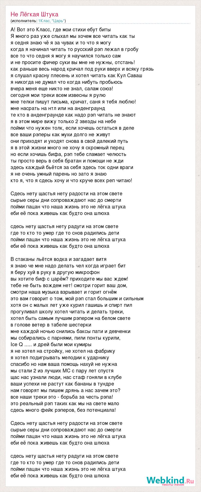 А! Вот это Класс, где мои стихи ебут биты Я много раз уже слыхал мы хочем все читать как ты я седня знаю чё я за чувак и то что я могу когда я начинал читать то русский рэп лежал в гробу все то что седня я могу я научился только сам и не просите фичер суки вы мне не нужны, отстань! как раньше весь народ кричал под руки вверх и всяку грязь я слушал красну плесень и хотел читать как Кул Саваш я никогда не думал что когда нибуть пробьюсь вчера меня еще никто не знал, салам союз! сегодня мои треки всем извесны я рулю мне телки пишут письма, кричат, саня я тебя люблю! мне насрать на нтл или на анденграунд те кто в анденграунде как надо рэп читать не знают я в этом мире вижу только 2 звезды на небе пойми что нужен толк, если хочешь остаться в деле все ваши рэперы как мухи долго не живут они приходят и уходят снова в свой далекий путь я в этой жизни много не хочу я скромный перец но если хочишь бифа, рэп тебе сламает челюсть ты просто верь в себя братан и помощи не жди здесь каждый бьётся за себя здесь ток одни враги я не очень умный парень но зато я знаю кто я, что я сдесь хочу и что круче всех реп читаю! Сдесь нету щастья нету радости на этом свете сырые серы дни сопроваждают нас до смерти пойми пацан что наша жизнь это не лёгка штука еби её пока живешь как будто она шлюха сдесь нету щастья нету радуги на этом свете где то кто то умер где то снов радились дети пойми пацан что наша жизнь это не лёгка штука еби её пока живешь как будто она шлюха В стаканы льётся водка и загадает витя я знаю че мне надо делать чел когда играет бит я беру хуй в руку в другую микрофон вы хотите биф с царём? приходите мы вас ждем! тебе не быть вождем нет! смотри горит ваш дом, смотри наша музыка взрывает и горит огнём это вам говорит о том, мой рэп стал большим и сильным хотя он с малых лет уже курил гашишь и спирт пил прогуливал школу хотел читать и делать треки, хотел быть самым лучшим рэпером на белом свете в голове ветер в табеле шестерки мне каждой ночью снились баксы пати и девченки мы собирались с парнями, пили понты курили, Ice Q ..... и дрей были мои кумиры я не хотел на стройку, не хотел на фабрику я хотел подигрывать мелодии к ударнику спасибо но нам ваша помощь нахуй не нужна мы стали 2 из лучших МС с пару лет спустя щас нас узнали люди, нас стаф гоняли в клубе ваши успехи не растут как бананы в тундре нам говорят мы пишем дрянь а нас зачем это? все наши треки это - борьба за честь рэпа! это реальный рэп таких как мы на свете мало сдесь много фейк рэперов, без потенциала! Сдесь нету щастья нету радости на этом свете сырые серы дни сопроваждают нас до смерти пойми пацан что наша жизнь это не лёгка штука еби её пока живешь как будто она шлюха сдесь нету щастья нету радуги на этом свете где то кто то умер где то снов радились дети пойми пацан что наша жизнь это не лёгка штука еби её пока живешь как будто она шлюха