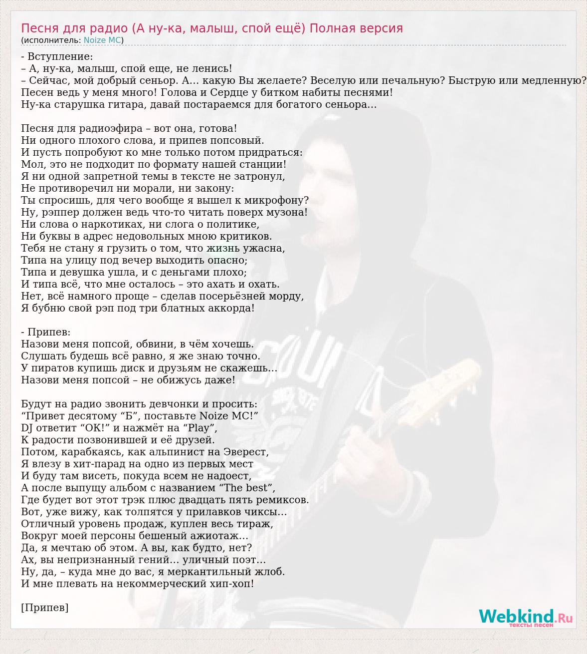 - Вступление: – А, ну-ка, малыш, спой еще, не ленись! – Сейчас, мой добрый сеньор. А… какую Вы желаете? Веселую или печальную? Быструю или медленную? Песен ведь у меня много! Голова и Сердце у битком набиты песнями! Ну-ка старушка гитара, давай постараемся для богатого сеньора… Песня для радиоэфира – вот она, готова! Ни одного плохого слова, и припев попсовый. И пусть попробуют ко мне только потом придраться: Мол, это не подходит по формату нашей станции! Я ни одной запретной темы в тексте не затронул, Не противоречил ни морали, ни закону: Ты спросишь, для чего вообще я вышел к микрофону? Ну, рэппер должен ведь что-то читать поверх музона! Ни слова о наркотиках, ни слога о политике, Ни буквы в адрес недовольных мною критиков. Тебя не стану я грузить о том, что жизнь ужасна, Типа на улицу под вечер выходить опасно; Типа и девушка ушла, и с деньгами плохо; И типа всё, что мне осталось – это ахать и охать. Нет, всё намного проще – сделав посерьёзней морду, Я бубню свой рэп под три блатных аккорда! - Припев: Назови меня попсой, обвини, в чём хочешь. Слушать будешь всё равно, я же знаю точно. У пиратов купишь диск и друзьям не скажешь… Назови меня попсой – не обижусь даже! Будут на радио звонить девчонки и просить: “Привет десятому “Б”, поставьте Noize MC!” DJ ответит “ОК!” и нажмёт на “Play”, К радости позвонившей и её друзей. Потом, карабкаясь, как альпинист на Эверест, Я влезу в хит-парад на одно из первых мест И буду там висеть, покуда всем не надоест, А после выпущу альбом с названием “The best”, Где будет вот этот трэк плюс двадцать пять ремиксов. Вот, уже вижу, как толпятся у прилавков чиксы… Отличный уровень продаж, куплен весь тираж, Вокруг моей персоны бешеный ажиотаж… Да, я мечтаю об этом. А вы, как будто, нет? Ах, вы непризнанный гений… уличный поэт… Ну, да, – куда мне до вас, я меркантильный жлоб. И мне плевать на некоммерческий хип-хоп! [Припев]
