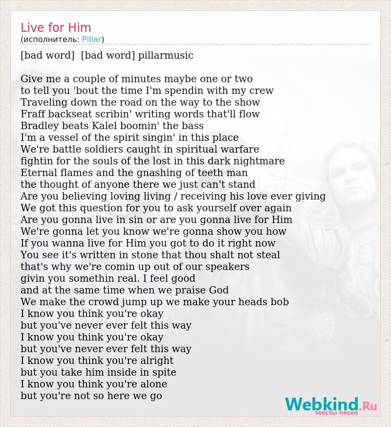[bad word] [bad word] pillarmusic Give me a couple of minutes maybe one or two to tell you 'bout the time I'm spendin with my crew Traveling down the road on the way to the show Fraff backseat scribin' writing words that'll flow Bradley beats Kalel boomin' the bass I'm a vessel of the spirit singin' in this place We're battle soldiers caught in spiritual warfare fightin for the souls of the lost in this dark nightmare Eternal flames and the gnashing of teeth man the thought of anyone there we just can't stand Are you believing loving living / receiving his love ever giving We got this question for you to ask yourself over again Are you gonna live in sin or are you gonna live for Him We're gonna let you know we're gonna show you how If you wanna live for Him you got to do it right now You see it's written in stone that thou shalt not steal that's why we're comin up out of our speakers givin you somethin real. I feel good and at the same time when we praise God We make the crowd jump up we make your heads bob I know you think you're okay but you've never ever felt this way I know you think you're okay but you've never ever felt this way I know you think you're alright but you take him inside in spite I know you think you're alone but you're not so here we go