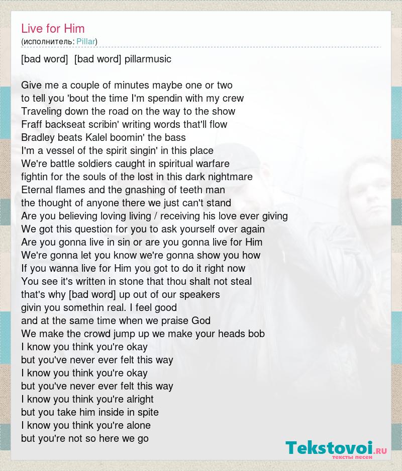 [bad word] [bad word] pillarmusic Give me a couple of minutes maybe one or two to tell you 'bout the time I'm spendin with my crew Traveling down the road on the way to the show Fraff backseat scribin' writing words that'll flow Bradley beats Kalel boomin' the bass I'm a vessel of the spirit singin' in this place We're battle soldiers caught in spiritual warfare fightin for the souls of the lost in this dark nightmare Eternal flames and the gnashing of teeth man the thought of anyone there we just can't stand Are you believing loving living / receiving his love ever giving We got this question for you to ask yourself over again Are you gonna live in sin or are you gonna live for Him We're gonna let you know we're gonna show you how If you wanna live for Him you got to do it right now You see it's written in stone that thou shalt not steal that's why [bad word] up out of our speakers givin you somethin real. I feel good and at the same time when we praise God We make the crowd jump up we make your heads bob I know you think you're okay but you've never ever felt this way I know you think you're okay but you've never ever felt this way I know you think you're alright but you take him inside in spite I know you think you're alone but you're not so here we go