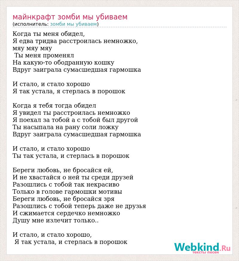 Когда ты меня обидел, Я едва тридва расстроилась немножко, мяу мяу мяу Ты меня променял На какую-то ободранную кошку Вдруг заиграла сумасшедшая гармошка И стало, и стало хорошо Я так устала, я стерлась в порошок Когда я тебя тогда обидел Я увидел ты расстроилась немножко Я поехал за тобой а с тобой был другой Ты насыпала на рану соли ложку Вдруг заиграла сумасшедшая гармошка И стало, и стало хорошо Ты так устала, и стерлась в порошок Береги любовь, не бросайся ей, И не хвастайся о ней ты среди друзей Разошлись с тобой так некрасиво Только в голове гармошки мотивы Береги любовь, не бросайся зря Разошлись с тобой теперь даже не друзья И сжимается сердечко немножко Душу мне излечит только.. И стало, и стало хорошо, Я так устала, и стерлась в порошок