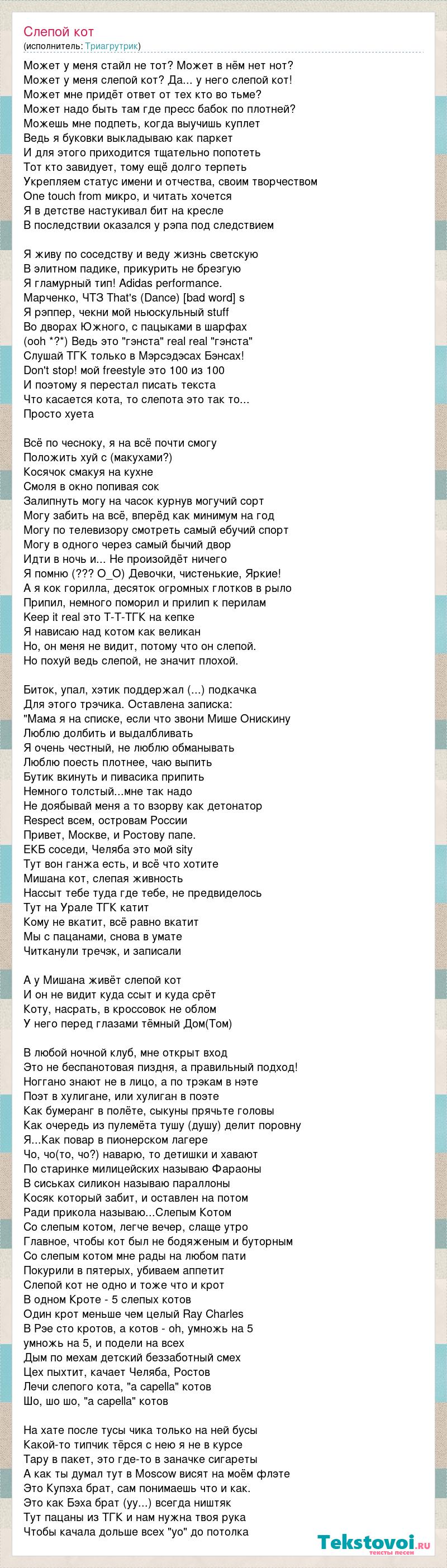 Может у меня стайл не тот? Может в нём нет нот? Может у меня слепой кот? Да... у него слепой кот! Может мне придёт ответ от тех кто во тьме? Может надо быть там где пресс бабок по плотней? Можешь мне подпеть, когда выучишь куплет Ведь я буковки выкладываю как паркет И для этого приходится тщательно попотеть Тот кто завидует, тому ещё долго терпеть Укрепляем статус имени и отчества, своим творчеством One touch from микро, и читать хочется Я в детстве настукивал бит на кресле В последствии оказался у рэпа под следствием Я живу по соседству и веду жизнь светскую В элитном падике, прикурить не брезгую Я гламурный тип! Adidas performance. Марченко, ЧТЗ That's (Dance) no comment's Я рэппер, чекни мой ньюскульный stuff Во дворах Южного, с пацыками в шарфах (ooh *?*) Ведь это "гэнста" real real "гэнста" Слушай ТГК только в Мэрсэдэсах Бэнсах! Don't stop! мой freestyle это 100 из 100 И поэтому я перестал писать текста Что касается кота, то слепота это так то... Просто хуета Всё по чесноку, я на всё почти смогу Положить хуй с (макухами?) Косячок смакуя на кухне Смоля в окно попивая сок Залипнуть могу на часок курнув могучий сорт Могу забить на всё, вперёд как минимум на год Могу по телевизору смотреть самый ебучий спорт Могу в одного через самый бычий двор Идти в ночь и... Не произойдёт ничего Я помню (??? О_О) Девочки, чистенькие, Яркие! А я кок горилла, десяток огромных глотков в рыло Припил, немного поморил и прилип к перилам Keep it real это Т-Т-ТГК на кепке Я нависаю над котом как великан Но, он меня не видит, потому что он слепой. Но похуй ведь слепой, не значит плохой. Биток, упал, хэтик поддержал (...) подкачка Для этого трэчика. Оставлена записка: "Мама я на списке, если что звони Мише Онискину Люблю долбить и выдалбливать Я очень честный, не люблю обманывать Люблю поесть плотнее, чаю выпить Бутик вкинуть и пивасика припить Немного толстый...мне так надо Не доябывай меня а то взорву как детонатор Respect всем, островам России Привет, Москве, и Ростову папе. ЕКБ соседи, Челяба это мой sity Тут вон ганжа есть, и всё что хотите Мишана кот, слепая живность Нассыт тебе туда где тебе, не предвиделось Тут на Урале ТГК катит Кому не вкатит, всё равно вкатит Мы с пацанами, снова в умате Читканули тречэк, и записали А у Мишана живёт слепой кот И он не видит куда ссыт и куда срёт Коту, насрать, в кроссовок не облом У него перед глазами тёмный Дом(Том) В любой ночной клуб, мне открыт вход Это не беспанотовая пиздня, а правильный подход! Ноггано знают не в лицо, а по трэкам в нэте Поэт в хулигане, или хулиган в поэте Как бумеранг в полёте, сыкуны прячьте головы Как очередь из пулемёта тушу (душу) делит поровну Я...Как повар в пионерском лагере Чо, чо(то, чо?) наварю, то детишки и хавают По старинке милицейских называю Фараоны В сиськах силикон называю параллоны Косяк который забит, и оставлен на потом Ради прикола называю...Слепым Котом Со слепым котом, легче вечер, слаще утро Главное, чтобы кот был не бодяженым и буторным Со слепым котом мне рады на любом пати Покурили в пятерых, убиваем аппетит Слепой кот не одно и тоже что и крот В одном Кроте - 5 слепых котов Один крот меньше чем целый Ray Charles В Рэе сто кротов, а котов - oh, умножь на 5 умножь на 5, и подели на всех Дым по мехам детский беззаботный смех Цех пыхтит, качает Челяба, Ростов Лечи слепого кота, "а сapella" котов Шо, шо шо, "a сapella" котов На хате после тусы чика только на ней бусы Какой-то типчик тёрся с нею я не в кур