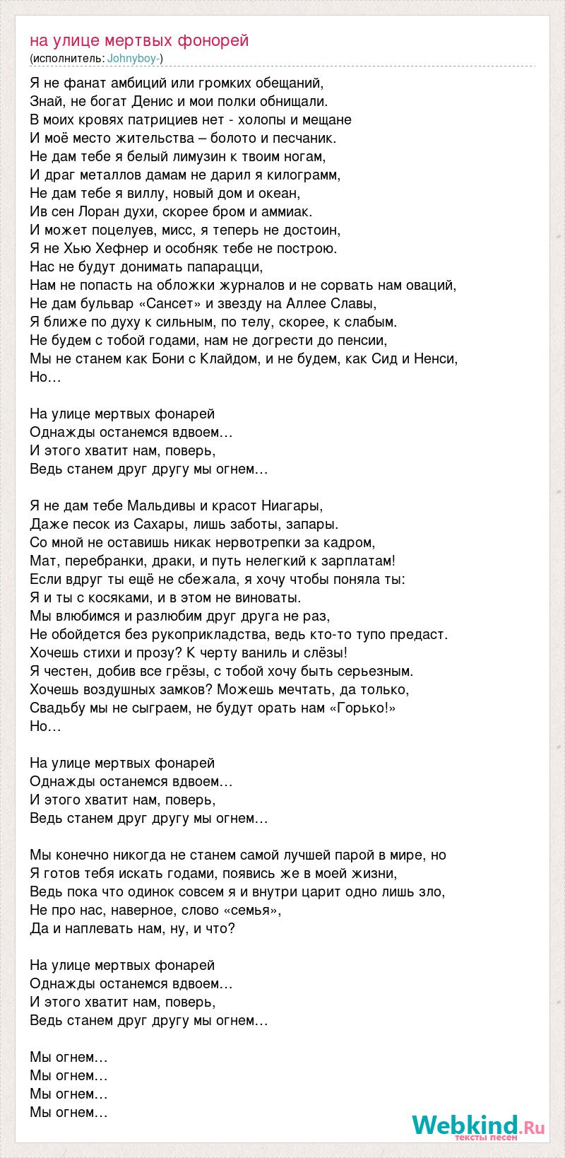 Я не фанат амбиций или громких обещаний, Знай, не богат Денис и мои полки обнищали. В моих кровях патрициев нет - холопы и мещане И моё место жительства – болото и песчаник. Не дам тебе я белый лимузин к твоим ногам, И драг металлов дамам не дарил я килограмм, Не дам тебе я виллу, новый дом и океан, Ив сен Лоран духи, скорее бром и аммиак. И может поцелуев, мисс, я теперь не достоин, Я не Хью Хефнер и особняк тебе не построю. Нас не будут донимать папарацци, Нам не попасть на обложки журналов и не сорвать нам оваций, Не дам бульвар «Сансет» и звезду на Аллее Славы, Я ближе по духу к сильным, по телу, скорее, к слабым. Не будем с тобой годами, нам не догрести до пенсии, Мы не станем как Бони с Клайдом, и не будем, как Сид и Ненси, Но… На улице мертвых фонарей Однажды останемся вдвоем… И этого хватит нам, поверь, Ведь станем друг другу мы огнем… Я не дам тебе Мальдивы и красот Ниагары, Даже песок из Сахары, лишь заботы, запары. Со мной не оставишь никак нервотрепки за кадром, Мат, перебранки, драки, и путь нелегкий к зарплатам! Если вдруг ты ещё не сбежала, я хочу чтобы поняла ты: Я и ты с косяками, и в этом не виноваты. Мы влюбимся и разлюбим друг друга не раз, Не обойдется без рукоприкладства, ведь кто-то тупо предаст. Хочешь стихи и прозу? К черту ваниль и слёзы! Я честен, добив все грёзы, с тобой хочу быть серьезным. Хочешь воздушных замков? Можешь мечтать, да только, Свадьбу мы не сыграем, не будут орать нам «Горько!» Но… На улице мертвых фонарей Однажды останемся вдвоем… И этого хватит нам, поверь, Ведь станем друг другу мы огнем… Мы конечно никогда не станем самой лучшей парой в мире, но Я готов тебя искать годами, появись же в моей жизни, Ведь пока что одинок совсем я и внутри царит одно лишь зло, Не про нас, наверное, слово «семья», Да и наплевать нам, ну, и что? На улице мертвых фонарей Однажды останемся вдвоем… И этого хватит нам, поверь, Ведь станем друг другу мы огнем… Мы огнем… Мы огнем… Мы огнем… Мы огнем…