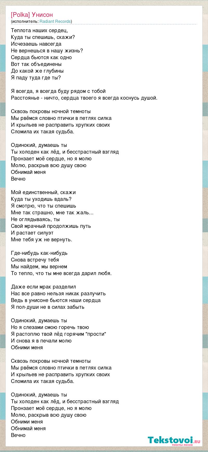 Теплота наших сердец, Куда ты спешишь, скажи? Исчезаешь навсегда Не вернешься в нашу жизнь? Сердца бьются как одно Вот так объединены До какой же глубины Я паду туда где ты? Я всегда, я всегда буду рядом с тобой Расстоянье - ничто, сердца твоего я всегда коснусь душой. Сквозь покровы ночной темноты Мы рвёмся словно птички в петлях силка И крыльев не расправить хрупких своих Сломила их такая судьба. Одинокий, думаешь ты Ты холоден как лёд, и бесстрастный взгляд Пронзает моё сердце, но я молю Молю, раскрыв всю душу свою Обнимай меня Вечно Мой единственный, скажи Куда ты уходишь вдаль? Я смотрю, что ты спешишь Мне так страшно, мне так жаль... Не оглядываясь, ты Свой мрачный продолжишь путь И растает силуэт Мне тебя уж не вернуть. Где-нибудь как-нибудь Снова встречу тебя Мы найдем, мы вернем То тепло, что ты мне всегда дарил любя. Даже если мрак разделил Нас все равно нельзя никак разлучить Ведь в унисоне бьются наши сердца Я пол-души не в силах забыть Одинокий, думаешь ты Но я слезами смою горечь твою Я растоплю твой лёд горячим "прости" И снова я в печали молю Обними меня Сквозь покровы ночной темноты Мы рвёмся словно птички в петлях силка И крыльев не расправить хрупких своих Сломила их такая судьба. Одинокий, думаешь ты Ты холоден как лёд, и бесстрастный взгляд Пронзает моё сердце, но я молю Молю, раскрыв всю душу свою Обними меня Обнимай меня Вечно