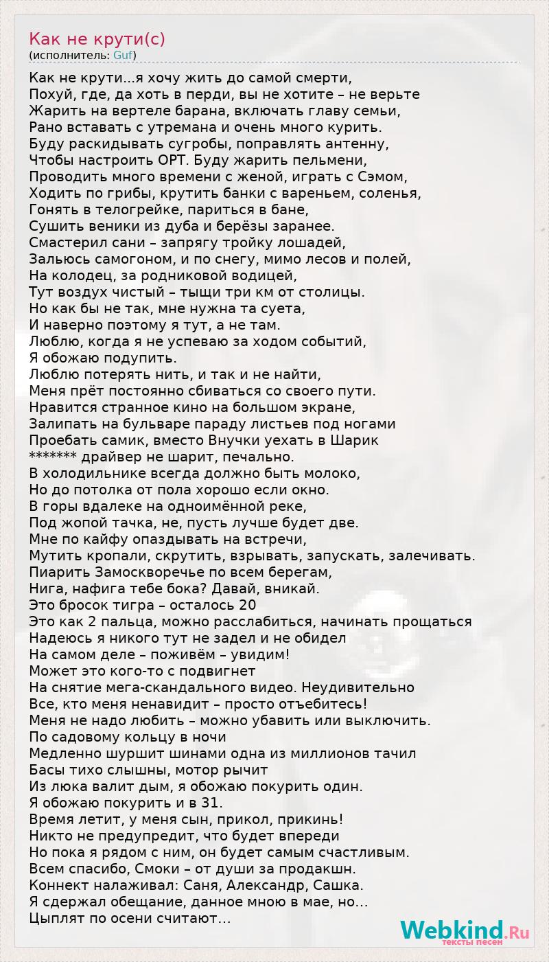 Как не крути...я хочу жить до самой смерти, Похуй, где, да хоть в перди, вы не хотите – не верьте Жарить на вертеле барана, включать главу семьи, Рано вставать с утремана и очень много курить. Буду раскидывать сугробы, поправлять антенну, Чтобы настроить ОРТ. Буду жарить пельмени, Проводить много времени с женой, играть с Сэмом, Ходить по грибы, крутить банки с вареньем, соленья, Гонять в телогрейке, париться в бане, Сушить веники из дуба и берёзы заранее. Смастерил сани – запрягу тройку лошадей, Зальюсь самогоном, и по снегу, мимо лесов и полей, На колодец, за родниковой водицей, Тут воздух чистый – тыщи три км от столицы. Но как бы не так, мне нужна та суета, И наверно поэтому я тут, а не там. Люблю, когда я не успеваю за ходом событий, Я обожаю подупить. Люблю потерять нить, и так и не найти, Меня прёт постоянно сбиваться со своего пути. Нравится странное кино на большом экране, Залипать на бульваре параду листьев под ногами Проебать самик, вместо Внучки уехать в Шарик ******* драйвер не шарит, печально. В холодильнике всегда должно быть молоко, Но до потолка от пола хорошо если окно. В горы вдалеке на одноимённой реке, Под жопой тачка, не, пусть лучше будет две. Мне по кайфу опаздывать на встречи, Мутить кропали, скрутить, взрывать, запускать, залечивать. Пиарить Замоскворечье по всем берегам, Нига, нафига тебе бока? Давай, вникай. Это бросок тигра – осталось 20 Это как 2 пальца, можно расслабиться, начинать прощаться Надеюсь я никого тут не задел и не обидел На самом деле – поживём – увидим! Может это кого-то с подвигнет На снятие мега-скандального видео. Неудивительно Все, кто меня ненавидит – просто отъебитесь! Меня не надо любить – можно убавить или выключить. По садовому кольцу в ночи Медленно шуршит шинами одна из миллионов тачил Басы тихо слышны, мотор рычит Из люка валит дым, я обожаю покурить один. Я обожаю покурить и в 31. Время летит, у меня сын, прикол, прикинь! Никто не предупредит, что будет впереди Но пока я рядом с ним, он будет самым счастливым. Всем спасибо, Смоки – от души за продакшн. Коннект налаживал: Саня, Александр, Сашка. Я сдержал обещание, данное мною в мае, но… Цыплят по осени считают…