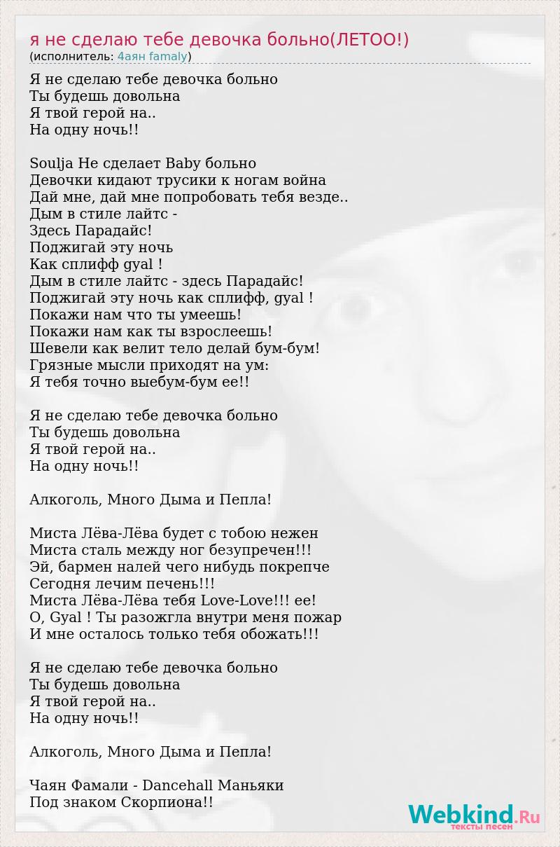 Я не сделаю тебе девочка больно Ты будешь довольна Я твой герой на.. На одну ночь!! Soulja Не сделает Baby больно Девочки кидают трусики к ногам война Дай мне, дай мне попробовать тебя везде.. Дым в стиле лайтс - Здесь Парадайс! Поджигай эту ночь Как сплифф gyal ! Дым в стиле лайтс - здесь Парадайс! Поджигай эту ночь как сплифф, gyal ! Покажи нам что ты умеешь! Покажи нам как ты взрослеешь! Шевели как велит тело делай бум-бум! Грязные мысли приходят на ум: Я тебя точно выебум-бум ее!! Я не сделаю тебе девочка больно Ты будешь довольна Я твой герой на.. На одну ночь!! Алкоголь, Много Дыма и Пепла! Миста Лёва-Лёва будет с тобою нежен Миста сталь между ног безупречен!!! Эй, бармен налей чего нибудь покрепче Сегодня лечим печень!!! Миста Лёва-Лёва тебя Love-Love!!! ее! O, Gyal ! Ты разожгла внутри меня пожар И мне осталось только тебя обожать!!! Я не сделаю тебе девочка больно Ты будешь довольна Я твой герой на.. На одну ночь!! Алкоголь, Много Дыма и Пепла! Чаян Фамали - Dancehall Маньяки Под знаком Скорпиона!!