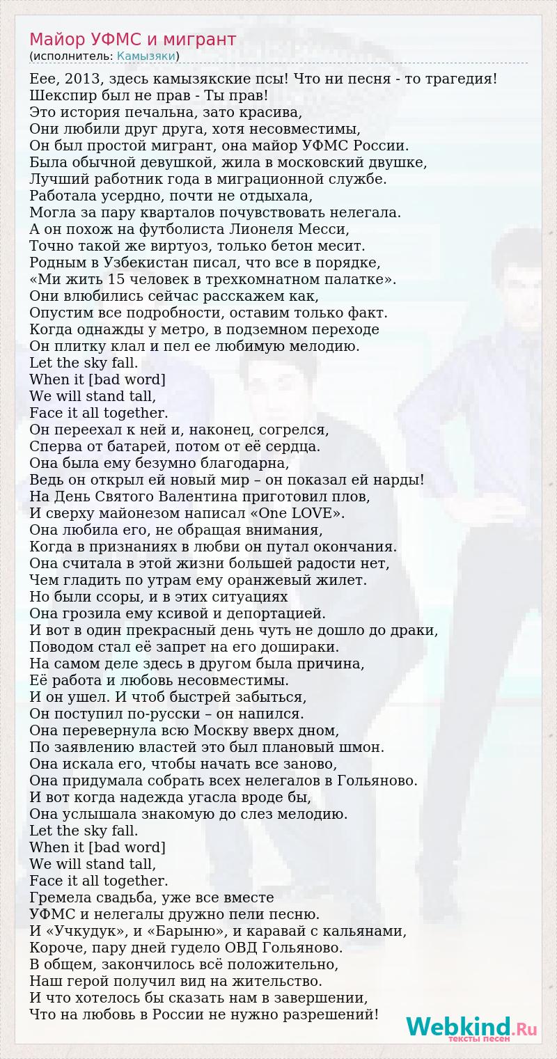Еее, 2013, здесь камызякские псы! Что ни песня - то трагедия! Шекспир был не прав - Ты прав! Это история печальна, зато красива, Они любили друг друга, хотя несовместимы, Он был простой мигрант, она майор УФМС России. Была обычной девушкой, жила в московский двушке, Лучший работник года в миграционной службе. Работала усердно, почти не отдыхала, Могла за пару кварталов почувствовать нелегала. А он похож на футболиста Лионеля Месси, Точно такой же виртуоз, только бетон месит. Родным в Узбекистан писал, что все в порядке, «Ми жить 15 человек в трехкомнатном палатке». Они влюбились сейчас расскажем как, Опустим все подробности, оставим только факт. Когда однажды у метро, в подземном переходе Он плитку клал и пел ее любимую мелодию. Let the sky fall. When it [bad word] We will stand tall, Face it all together. Он переехал к ней и, наконец, согрелся, Сперва от батарей, потом от её сердца. Она была ему безумно благодарна, Ведь он открыл ей новый мир – он показал ей нарды! На День Святого Валентина приготовил плов, И сверху майонезом написал «One LOVE». Она любила его, не обращая внимания, Когда в признаниях в любви он путал окончания. Она считала в этой жизни большей радости нет, Чем гладить по утрам ему оранжевый жилет. Но были ссоры, и в этих ситуациях Она грозила ему ксивой и депортацией. И вот в один прекрасный день чуть не дошло до драки, Поводом стал её запрет на его дошираки. На самом деле здесь в другом была причина, Её работа и любовь несовместимы. И он ушел. И чтоб быстрей забыться, Он поступил по-русски – он напился. Она перевернула всю Москву вверх дном, По заявлению властей это был плановый шмон. Она искала его, чтобы начать все заново, Она придумала собрать всех нелегалов в Гольяново. И вот когда надежда угасла вроде бы, Она услышала знакомую до слез мелодию. Let the sky fall. When it [bad word] We will stand tall, Face it all together. Гремела свадьба, уже все вместе УФМС и нелегалы дружно пели песню. И «Учкудук», и «Барыню», и каравай с кальянами, Короче, пару дней гудело ОВД Гольяново. В общем, закончилось всё положительно, Наш герой получил вид на жительство. И что хотелось бы сказать нам в завершении, Что на любовь в России не нужно разрешений!