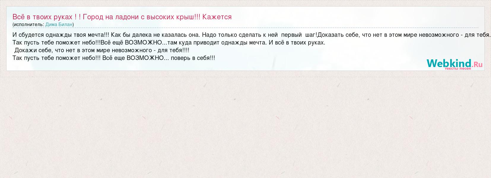 Главная→Исполнители→Дима Билан→Всё в твоих руках ! ! Город на ладони с высоких крыш!!! Кажется вот-вот и