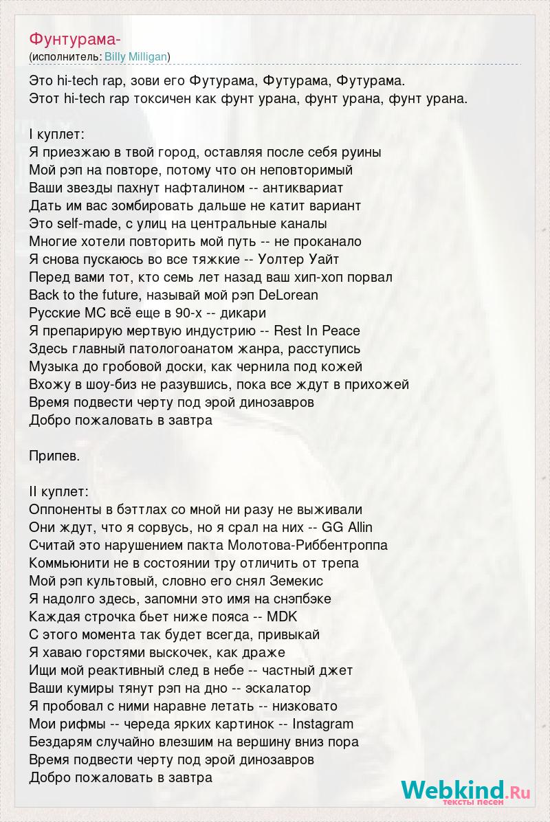 Это hi-tech rap, зови его Футурама, Футурама, Футурама. Этот hi-tech rap токсичен как фунт урана, фунт урана, фунт урана. I куплет: Я приезжаю в твой город, оставляя после себя руины Мой рэп на повторе, потому что он неповторимый Ваши звезды пахнут нафталином -- антиквариат Дать им вас зомбировать дальше не катит вариант Это self-made, с улиц на центральные каналы Многие хотели повторить мой путь -- не проканало Я снова пускаюсь во все тяжкие -- Уолтер Уайт Перед вами тот, кто семь лет назад ваш хип-хоп порвал Back to the future, называй мой рэп DeLorean Русские MC всё еще в 90-х -- дикари Я препарирую мертвую индустрию -- Rest In Peace Здесь главный патологоанатом жанра, расступись Музыка до гробовой доски, как чернила под кожей Вхожу в шоу-биз не разувшись, пока все ждут в прихожей Время подвести черту под эрой динозавров Добро пожаловать в завтра Припев. II куплет: Оппоненты в бэттлах со мной ни разу не выживали Они ждут, что я сорвусь, но я срал на них -- GG Allin Считай это нарушением пакта Молотова-Риббентроппа Коммьюнити не в состоянии тру отличить от трепа Мой рэп культовый, словно его снял Земекис Я надолго здесь, запомни это имя на снэпбэке Каждая строчка бьет ниже пояса -- MDK С этого момента так будет всегда, привыкай Я хаваю горстями выскочек, как драже Ищи мой реактивный след в небе -- частный джет Ваши кумиры тянут рэп на дно -- эскалатор Я пробовал с ними наравне летать -- низковато Мои рифмы -- череда ярких картинок -- Instagram Бездарям случайно влезшим на вершину вниз пора Время подвести черту под эрой динозавров Добро пожаловать в завтра