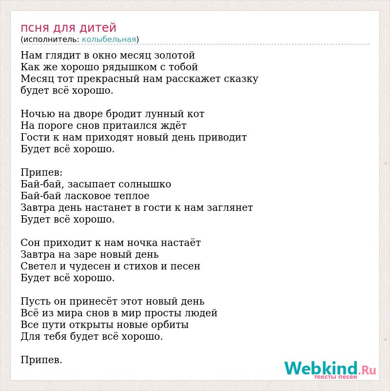 Нам глядит в окно месяц золотой Как же хорошо рядышком с тобой Месяц тот прекрасный нам расскажет сказку будет всё хорошо. Ночью на дворе бродит лунный кот На пороге снов притаился ждёт Гости к нам приходят новый день приводит Будет всё хорошо. Припев: Бай-бай, засыпает солнышко Бай-бай ласковое теплое Завтра день настанет в гости к нам заглянет Будет всё хорошо. Сон приходит к нам ночка настаёт Завтра на заре новый день Светел и чудесен и стихов и песен Будет всё хорошо. Пусть он принесёт этот новый день Всё из мира снов в мир просты людей Все пути открыты новые орбиты Для тебя будет всё хорошо. Припев.