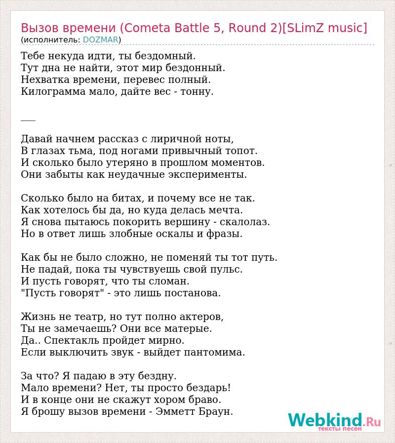 А как ты думаешь, о чем песня "Вызов времени (Cometa Battle 5, Round 2)[SLimZ music]" ?