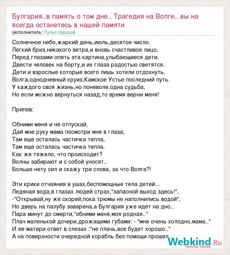 Солнечное небо,жаркий день,июль,десятое число. Легкий бриз,никакого ветра,и вновь счастливое лицо, Перед глазами опять эта картина,улыбающиеся дети, Двести человек на борту,и их глаза радостью светятся. Дети и взрослые которые всего лишь хотели отдохнуть, Волга,однодневный круиз,Камское Устье последний путь. У каждого своя жизнь,но поневоле,одна судьба, Но если можно вернуться назад,то время верни меня! Припев: Обними меня и не отпускай, Дай мне руку мама посмотри мне в глаза, Там еще осталась частичка тепла, Там еще осталась частичка тепла. Как же тяжело, что происходит? Волны забирают и с собой уносят.. Больше нету сил и скажу три слова, за что Волга?! Эти крики отчаяния в ушах,беспомощные тела детей... Ледяная вода,в глазах людей страх,"запасной выход здесь!", -"Открывай,ну же скорей,пока трюмы не наполнились водой", Но дверь на палубу заварена,а Булгария уже идет на дно.. Пара минут до смерти,"обними меня,моя родная.." Плач маленькой дочери,дрожащими губами: - "мне очень холодно,мама.." И ее матери ответ в слезах :"не плачь,все будет хорошо.." А на поверхности очередной корабль без помощи прошел...