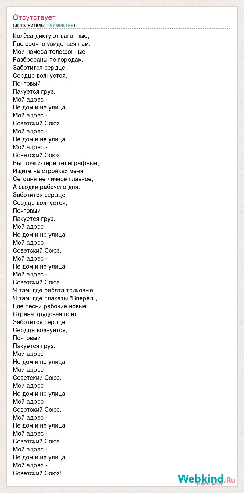 Колёса диктуют вагонные, Где срочно увидеться нам. Мои номера телефонные Разбросаны по городам. Заботится сердце, Сердце волнуется, Почтовый Пакуется груз. Мой адрес - Не дом и не улица, Мой адрес - Советский Союз. Мой адрес - Не дом и не улица. Мой адрес - Советский Союз. Вы, точки-тире телеграфные, Ищите на стройках меня. Сегодня не личное главное, А сводки рабочего дня. Заботится сердце, Сердце волнуется, Почтовый Пакуется груз. Мой адрес - Не дом и не улица, Мой адрес - Советский Союз. Мой адрес - Не дом и не улица, Мой адрес - Советский Союз. Я там, где ребята толковые, Я там, где плакаты "Вперёд", Где песни рабочие новые Страна трудовая поёт. Заботится сердце, Сердце волнуется, Почтовый Пакуется груз. Мой адрес - Не дом и не улица, Мой адрес - Советский Союз. Мой адрес - Не дом и не улица, Мой адрес - Советский Союз. Мой адрес - Не дом и не улица, Мой адрес - Советский Союз. Мой адрес - Не дом и не улица, Мой адрес - Советский Союз!