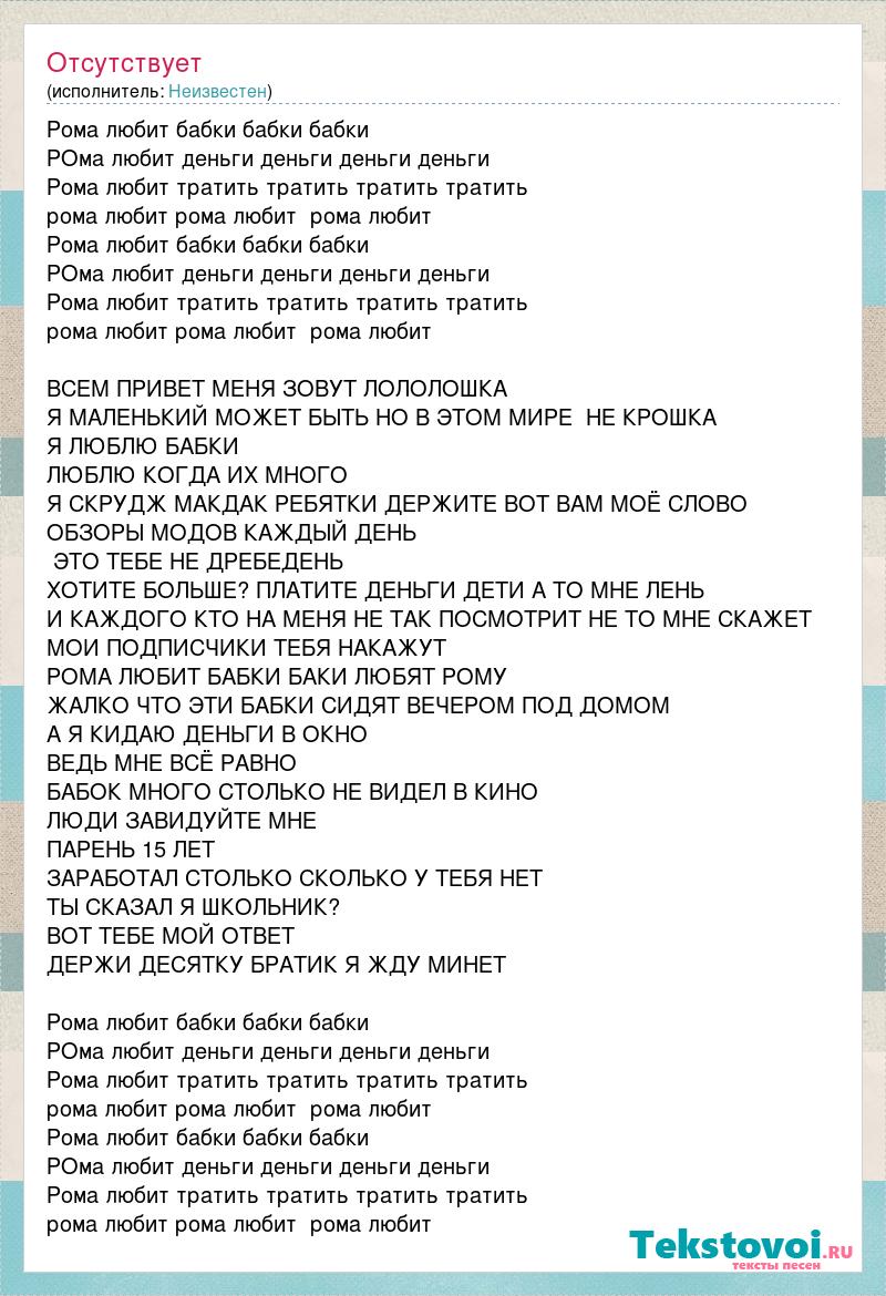 Рома любит бабки бабки бабки РОма любит деньги деньги деньги деньги Рома любит тратить тратить тратить тратить рома любит рома любит рома любит Рома любит бабки бабки бабки РОма любит деньги деньги деньги деньги Рома любит тратить тратить тратить тратить рома любит рома любит рома любит ВСЕМ ПРИВЕТ МЕНЯ ЗОВУТ ЛОЛОЛОШКА Я МАЛЕНЬКИЙ МОЖЕТ БЫТЬ НО В ЭТОМ МИРЕ НЕ КРОШКА Я ЛЮБЛЮ БАБКИ ЛЮБЛЮ КОГДА ИХ МНОГО Я СКРУДЖ МАКДАК РЕБЯТКИ ДЕРЖИТЕ ВОТ ВАМ МОЁ СЛОВО ОБЗОРЫ МОДОВ КАЖДЫЙ ДЕНЬ ЭТО ТЕБЕ НЕ ДРЕБЕДЕНЬ ХОТИТЕ БОЛЬШЕ? ПЛАТИТЕ ДЕНЬГИ ДЕТИ А ТО МНЕ ЛЕНЬ И КАЖДОГО КТО НА МЕНЯ НЕ ТАК ПОСМОТРИТ НЕ ТО МНЕ СКАЖЕТ МОИ ПОДПИСЧИКИ ТЕБЯ НАКАЖУТ РОМА ЛЮБИТ БАБКИ БАКИ ЛЮБЯТ РОМУ ЖАЛКО ЧТО ЭТИ БАБКИ СИДЯТ ВЕЧЕРОМ ПОД ДОМОМ А Я КИДАЮ ДЕНЬГИ В ОКНО ВЕДЬ МНЕ ВСЁ РАВНО БАБОК МНОГО СТОЛЬКО НЕ ВИДЕЛ В КИНО ЛЮДИ ЗАВИДУЙТЕ МНЕ ПАРЕНЬ 15 ЛЕТ ЗАРАБОТАЛ СТОЛЬКО СКОЛЬКО У ТЕБЯ НЕТ ТЫ СКАЗАЛ Я ШКОЛЬНИК? ВОТ ТЕБЕ МОЙ ОТВЕТ ДЕРЖИ ДЕСЯТКУ БРАТИК Я ЖДУ МИНЕТ Рома любит бабки бабки бабки РОма любит деньги деньги деньги деньги Рома любит тратить тратить тратить тратить рома любит рома любит рома любит Рома любит бабки бабки бабки РОма любит деньги деньги деньги деньги Рома любит тратить тратить тратить тратить рома любит рома любит рома любит