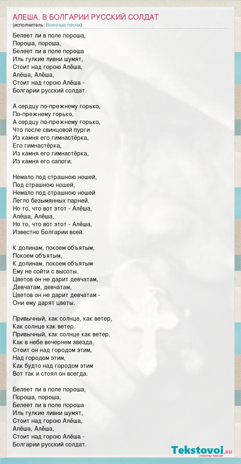 Белеет ли в поле пороша, Пороша, пороша, Белеет ли в поле пороша Иль гулкие ливни шумят, Стоит над горою Алёша, Алёша, Алёша, Стоит над горою Алёша - Болгарии русский солдат. А сердцу по-прежнему горько, По-прежнему горько, А сердцу по-прежнему горько, Что после свинцовой пурги Из камня его гимнастёрка, Его гимнастёрка, Из камня его гимнастёрка, Из камня его сапоги. Немало под страшною ношей, Под страшною ношей, Немало под страшною ношей Легло безымянных парней. Но то, что вот этот - Алёша, Алёша, Алёша, Но то, что вот этот - Алёша, Известно Болгарии всей. К долинам, покоем объятым, Покоем объятым, К долинам, покоем объятым Ему не сойти с высоты. Цветов он не дарит девчатам, Девчатам, девчатам, Цветов он не дарит девчатам - Они ему дарят цветы. Привычный, как солнце, как ветер, Как солнце как ветер. Привычный, как солнце как ветер, Как в небе вечернем звезда, Стоит он над городом этим, Над городом этим, Как будто над городом этим Вот так и стоял он всегда. Белеет ли в поле пороша, Пороша, пороша, Белеет ли в поле пороша Иль гулкие ливни шумят, Стоит над горою Алёша, Алёша, Алёша, Стоит над горою Алёша - Болгарии русский солдат.