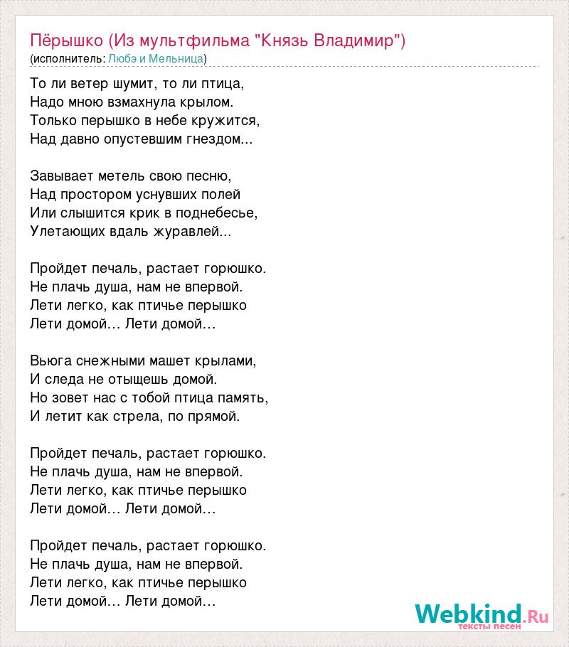 То ли ветер шумит, то ли птица, Надо мною взмахнула крылом. Только перышко в небе кружится, Над давно опустевшим гнездом... Завывает метель свою песню, Над простором уснувших полей Или слышится крик в поднебесье, Улетающих вдаль журавлей... Пройдет печаль, растает горюшко. Не плачь душа, нам не впервой. Лети легко, как птичье перышко Лети домой… Лети домой… Вьюга снежными машет крылами, И следа не отыщешь домой. Но зовет нас с тобой птица память, И летит как стрела, по прямой. Пройдет печаль, растает горюшко. Не плачь душа, нам не впервой. Лети легко, как птичье перышко Лети домой… Лети домой… Пройдет печаль, растает горюшко. Не плачь душа, нам не впервой. Лети легко, как птичье перышко Лети домой… Лети домой…