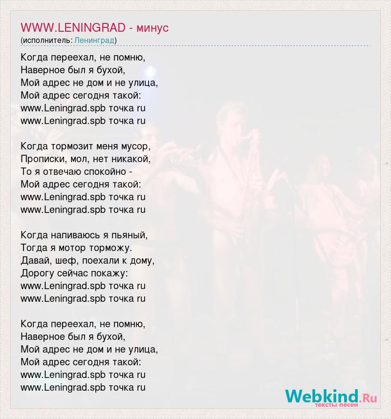 Когда переехал, не помню, Наверное был я бухой, Мой адрес не дом и не улица, Мой адрес сегодня такой: www.Leningrad.spb точка ru www.Leningrad.spb точка ru Когда тормозит меня мусор, Прописки, мол, нет никакой, То я отвечаю спокойно - Мой адрес сегодня такой: www.Leningrad.spb точка ru www.Leningrad.spb точка ru Когда напиваюсь я пьяный, Тогда я мотор торможу. Давай, шеф, поехали к дому, Дорогу сейчас покажу: www.Leningrad.spb точка ru www.Leningrad.spb точка ru Когда переехал, не помню, Наверное был я бухой, Мой адрес не дом и не улица, Мой адрес сегодня такой: www.Leningrad.spb точка ru www.Leningrad.spb точка ru