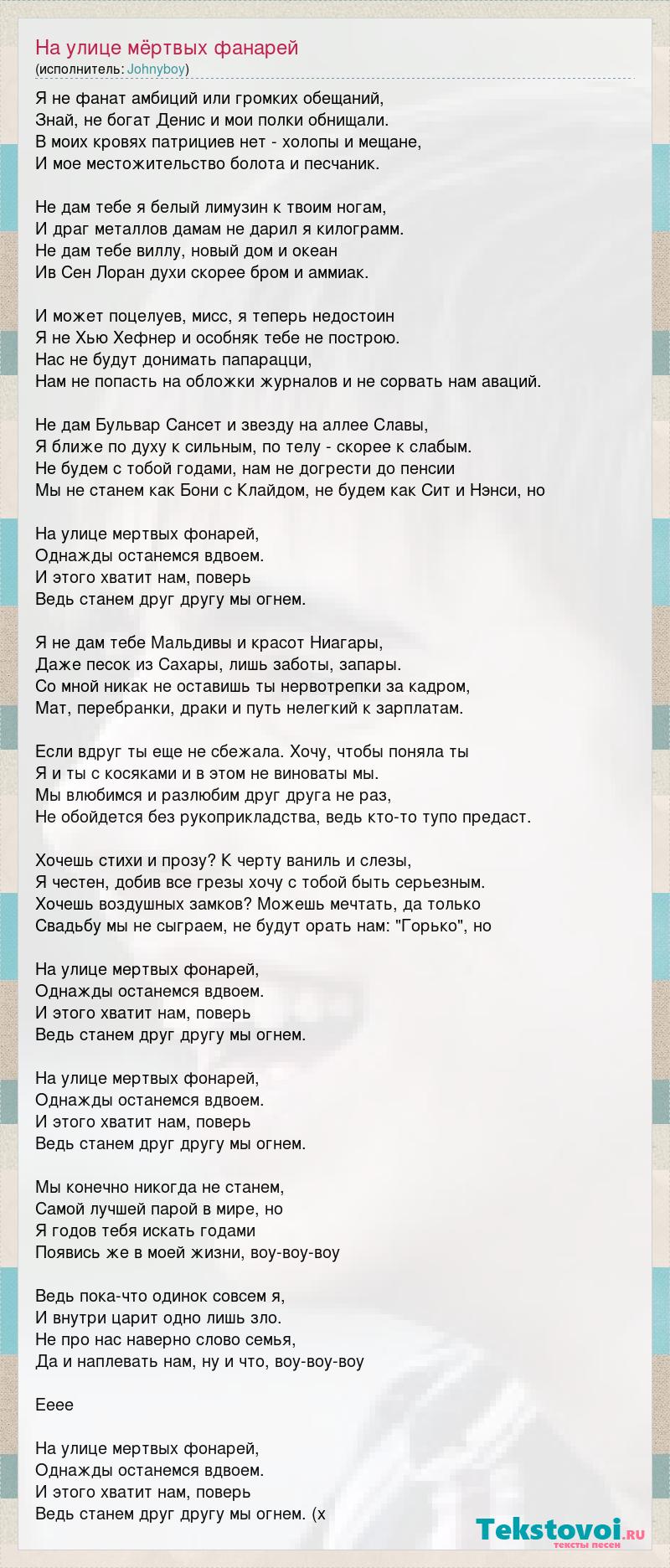 Я не фанат амбиций или громких обещаний, Знай, не богат Денис и мои полки обнищали. В моих кровях патрициев нет - холопы и мещане, И мое местожительство болота и песчаник. Не дам тебе я белый лимузин к твоим ногам, И драг металлов дамам не дарил я килограмм. Не дам тебе виллу, новый дом и океан Ив Сен Лоран духи скорее бром и аммиак. И может поцелуев, мисс, я теперь недостоин Я не Хью Хефнер и особняк тебе не построю. Нас не будут донимать папарацци, Нам не попасть на обложки журналов и не сорвать нам аваций. Не дам Бульвар Сансет и звезду на аллее Славы, Я ближе по духу к сильным, по телу - скорее к слабым. Не будем с тобой годами, нам не догрести до пенсии Мы не станем как Бони с Клайдом, не будем как Сит и Нэнси, но На улице мертвых фонарей, Однажды останемся вдвоем. И этого хватит нам, поверь Ведь станем друг другу мы огнем. Я не дам тебе Мальдивы и красот Ниагары, Даже песок из Сахары, лишь заботы, запары. Со мной никак не оставишь ты нервотрепки за кадром, Мат, перебранки, драки и путь нелегкий к зарплатам. Если вдруг ты еще не сбежала. Хочу, чтобы поняла ты Я и ты с косяками и в этом не виноваты мы. Мы влюбимся и разлюбим друг друга не раз, Не обойдется без рукоприкладства, ведь кто-то тупо предаст. Хочешь стихи и прозу? К черту ваниль и слезы, Я честен, добив все грезы хочу с тобой быть серьезным. Хочешь воздушных замков? Можешь мечтать, да только Свадьбу мы не сыграем, не будут орать нам: "Горько", но На улице мертвых фонарей, Однажды останемся вдвоем. И этого хватит нам, поверь Ведь станем друг другу мы огнем. На улице мертвых фонарей, Однажды останемся вдвоем. И этого хватит нам, поверь Ведь станем друг другу мы огнем. Мы конечно никогда не станем, Самой лучшей парой в мире, но Я годов тебя искать годами Появись же в моей жизни, воу-воу-воу Ведь пока-что одинок совсем я, И внутри царит одно лишь зло. Не про нас наверно слово семья, Да и наплевать нам, ну и что, воу-воу-воу Ееее На улице мертвых фонарей, Однажды останемся вдвоем. И этого хватит нам, поверь Ведь станем друг другу мы огнем. (x