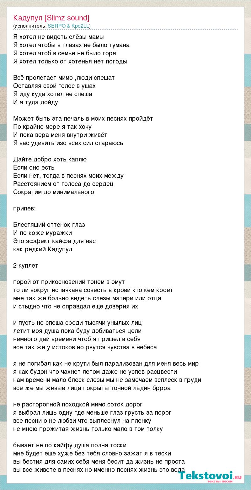 Я хотел не видеть слёзы мамы Я хотел чтобы в глазах не было тумана Я хотел чтоб в семье не было горя Я хотел только от хотенья нет погоды Всё пролетает мимо ,люди спешат Оставляя свой голос в ушах Я иду куда хотел не спеша И я туда дойду Может быть эта печаль в моих песнях пройдёт По крайне мере я так хочу И пока вера меня внутри живёт Я вас удивить изо всех сил стараюсь Дайте добро хоть каплю Если оно есть Если нет, тогда в песнях моих между Расстоянием от голоса до сердец Сократим до минимального припев: Блестящий оттенок глаз И по коже муражки Это эффект кайфа для нас как редкий Кадупул 2 куплет порой от прикосновений тонем в омут то ли вокруг испачкана совесть в крови кто кем кроет мне так же больно видеть слезы матери или отца и стыдно что не оправдал еще доверия их и пусть не спеша среди тысячи унылых лиц летит моя душа пока буду добиваться цели немного дай времени чтоб я пришел в себя все так же у истоков но рвутся чувства в небеса я не погибал как не крути был парализован для меня весь мир я как будон что чахнет летом даже не успев расцвести нам времени мало блеск слезы мы не замечаем всплеск в груди все же мы живые лица покрыты тонной льдин бррра не расторопной походкой мимо соток дорог я выбрал лишь одну где меньше глаз грусть за порог все песни о не любви что выплеснул на пленку не мною прожитая жизнь только мало в том толку бывает не по кайфу душа полна тоски мне будет еще хуже без тебя словно зажат я в тески вы бестия для самих себя меня бесит да жизнь не проста вы все живете в песнях но именно песнях жизнь это вода