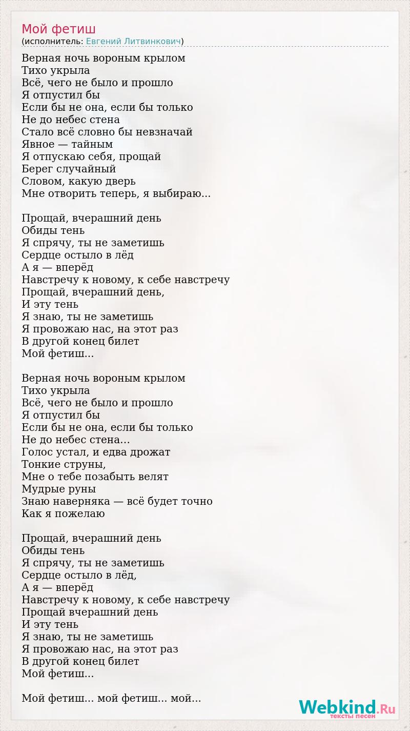 Верная ночь вороным крылом Тихо укрыла Всё, чего не было и прошло Я отпустил бы Если бы не она, если бы только Не до небес стена Стало всё словно бы невзначай Явное — тайным Я отпускаю себя, прощай Берег случайный Словом, какую дверь Мне отворить теперь, я выбираю... Прощай, вчерашний день Обиды тень Я спрячу, ты не заметишь Сердце остыло в лёд А я — вперёд Навстречу к новому, к себе навстречу Прощай, вчерашний день, И эту тень Я знаю, ты не заметишь Я провожаю нас, на этот раз В другой конец билет Мой фетиш... Верная ночь вороным крылом Тихо укрыла Всё, чего не было и прошло Я отпустил бы Если бы не она, если бы только Не до небес стена… Голос устал, и едва дрожат Тонкие струны, Мне о тебе позабыть велят Мудрые руны Знаю наверняка — всё будет точно Как я пожелаю Прощай, вчерашний день Обиды тень Я спрячу, ты не заметишь Сердце остыло в лёд, А я — вперёд Навстречу к новому, к себе навстречу Прощай вчерашний день И эту тень Я знаю, ты не заметишь Я провожаю нас, на этот раз В другой конец билет Мой фетиш... Мой фетиш... мой фетиш... мой...