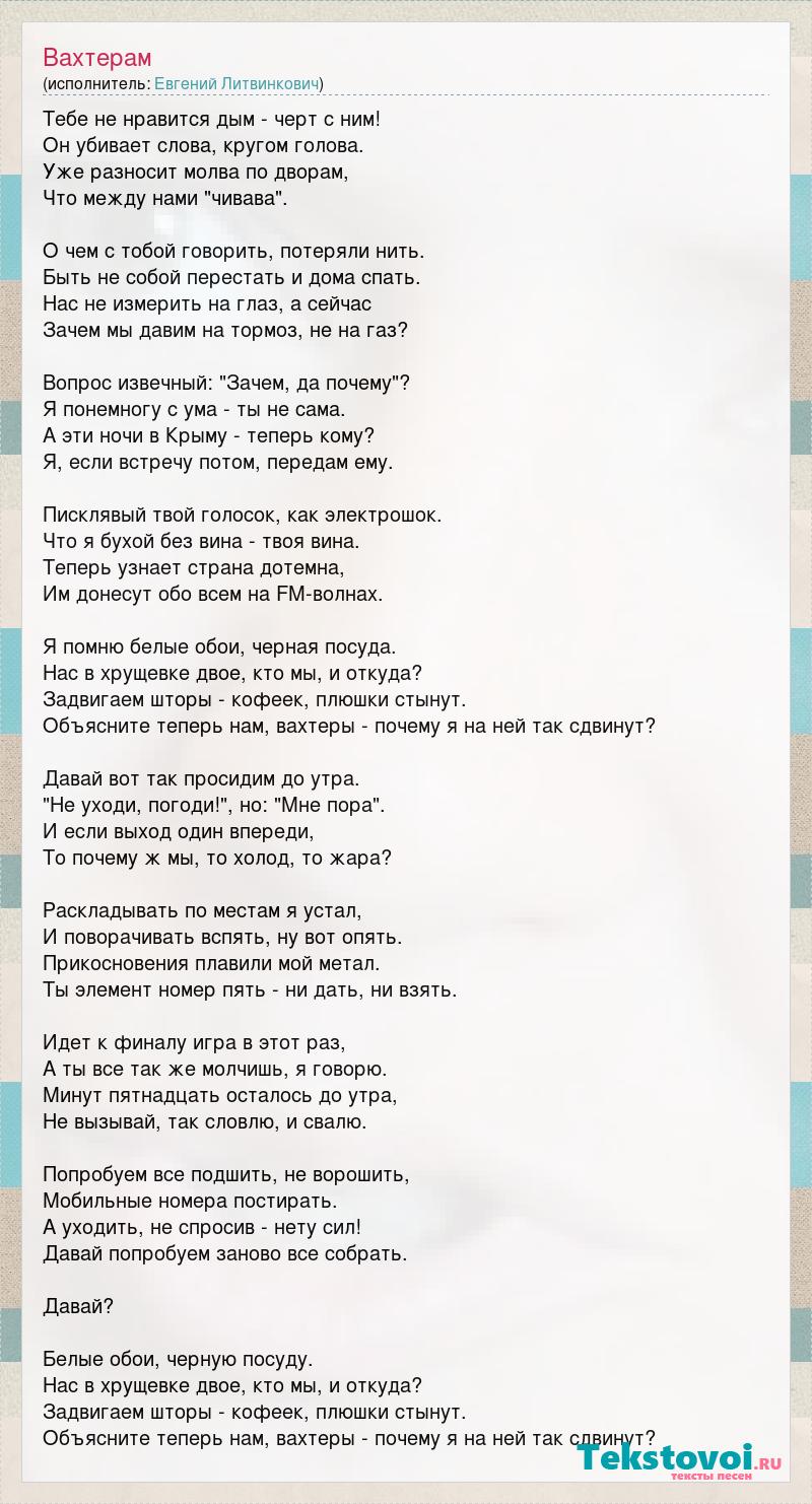 Тебе не нравится дым - черт с ним! Он убивает слова, кругом голова. Уже разносит молва по дворам, Что между нами "чивава". О чем с тобой говорить, потеряли нить. Быть не собой перестать и дома спать. Нас не измерить на глаз, а сейчас Зачем мы давим на тормоз, не на газ? Вопрос извечный: "Зачем, да почему"? Я понемногу с ума - ты не сама. А эти ночи в Крыму - теперь кому? Я, если встречу потом, передам ему. Писклявый твой голосок, как электрошок. Что я бухой без вина - твоя вина. Теперь узнает страна дотемна, Им донесут обо всем на FM-волнах. Я помню белые обои, черная посуда. Нас в хрущевке двое, кто мы, и откуда? Задвигаем шторы - кофеек, плюшки стынут. Объясните теперь нам, вахтеры - почему я на ней так сдвинут? Давай вот так просидим до утра. "Не уходи, погоди!", но: "Мне пора". И если выход один впереди, То почему ж мы, то холод, то жара? Раскладывать по местам я устал, И поворачивать вспять, ну вот опять. Прикосновения плавили мой метал. Ты элемент номер пять - ни дать, ни взять. Идет к финалу игра в этот раз, А ты все так же молчишь, я говорю. Минут пятнадцать осталось до утра, Не вызывай, так словлю, и свалю. Попробуем все подшить, не ворошить, Мобильные номера постирать. А уходить, не спросив - нету сил! Давай попробуем заново все собрать. Давай? Белые обои, черную посуду. Нас в хрущевке двое, кто мы, и откуда? Задвигаем шторы - кофеек, плюшки стынут. Объясните теперь нам, вахтеры - почему я на ней так сдвинут?