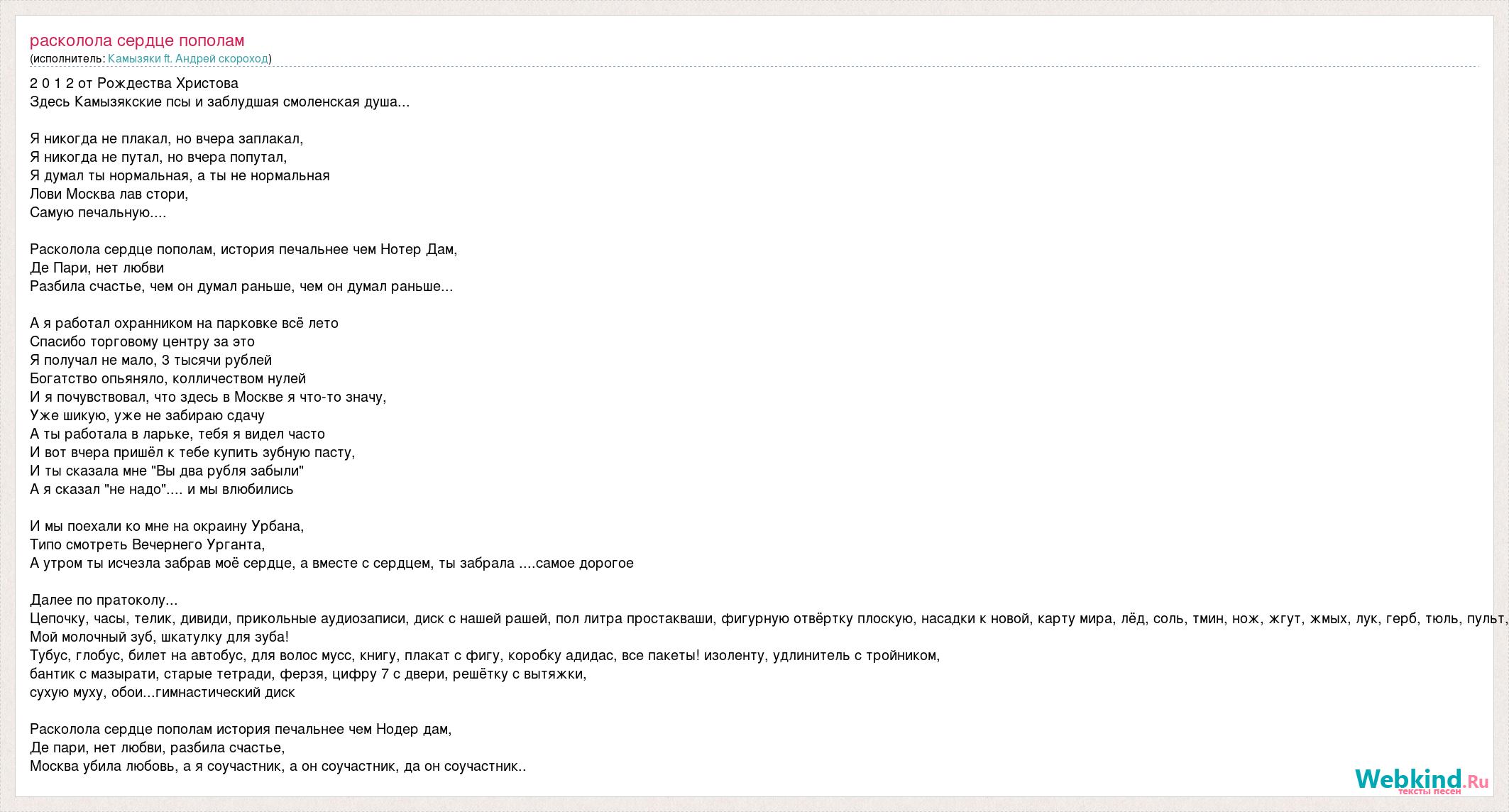 2 0 1 2 от Рождества Христова Здесь Камызякские псы и заблудшая смоленская душа... Я никогда не плакал, но вчера заплакал, Я никогда не путал, но вчера попутал, Я думал ты нормальная, а ты не нормальная Лови Москва лав стори, Самую печальную.... Расколола сердце пополам, история печальнее чем Нотер Дам, Де Пари, нет любви Разбила счастье, чем он думал раньше, чем он думал раньше... А я работал охранником на парковке всё лето Спасибо торговому центру за это Я получал не мало, 3 тысячи рублей Богатство опьяняло, колличеством нулей И я почувствовал, что здесь в Москве я что-то значу, Уже шикую, уже не забираю сдачу А ты работала в ларьке, тебя я видел часто И вот вчера пришёл к тебе купить зубную пасту, И ты сказала мне "Вы два рубля забыли" А я сказал "не надо".... и мы влюбились И мы поехали ко мне на окраину Урбана, Типо смотреть Вечернего Урганта, А утром ты исчезла забрав моё сердце, а вместе с сердцем, ты забрала ....самое дорогое Далее по пратоколу... Цепочку, часы, телик, дивиди, прикольные аудиозаписи, диск с нашей рашей, пол литра простакваши, фигурную отвёртку плоскую, насадки к новой, карту мира, лёд, соль, тмин, нож, жгут, жмых, лук, герб, тюль, пульт, Мой молочный зуб, шкатулку для зуба! Тубус, глобус, билет на автобус, для волос мусс, книгу, плакат с фигу, коробку адидас, все пакеты! изоленту, удлинитель с тройником, бантик с мазырати, старые тетради, ферзя, цифру 7 с двери, решётку с вытяжки, сухую муху, обои...гимнастический диск Расколола сердце пополам история печальнее чем Нодер дам, Де пари, нет любви, разбила счастье, Москва убила любовь, а я соучастник, а он соучастник, да он соучастник..