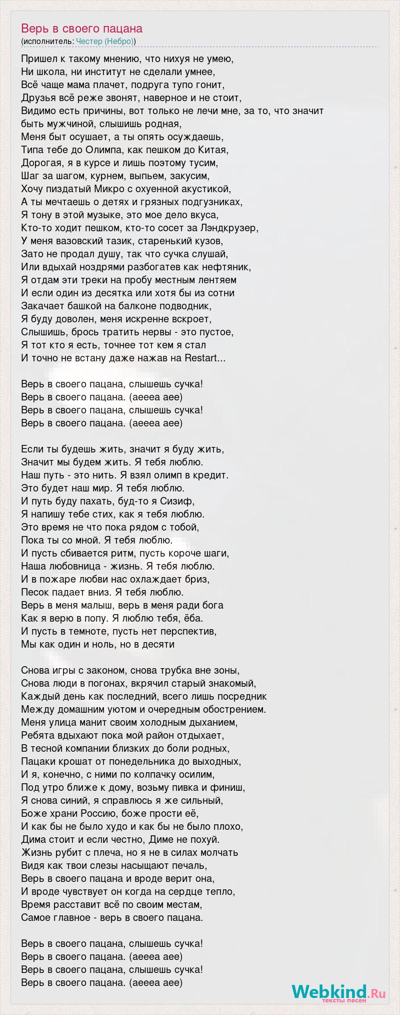 Пришел к такому мнению, что нихуя не умею, Ни школа, ни институт не сделали умнее, Всё чаще мама плачет, подруга тупо гонит, Друзья всё реже звонят, наверное и не стоит, Видимо есть причины, вот только не лечи мне, за то, что значит быть мужчиной, слышишь родная, Меня быт осушает, а ты опять осуждаешь, Типа тебе до Олимпа, как пешком до Китая, Дорогая, я в курсе и лишь поэтому тусим, Шаг за шагом, курнем, выпьем, закусим, Хочу пиздатый Микро с охуенной акустикой, А ты мечтаешь о детях и грязных подгузниках, Я тону в этой музыке, это мое дело вкуса, Кто-то ходит пешком, кто-то сосет за Лэндкрузер, У меня вазовский тазик, старенький кузов, Зато не продал душу, так что сучка слушай, Или вдыхай ноздрями разбогатев как нефтяник, Я отдам эти треки на пробу местным лентяем И если один из десятка или хотя бы из сотни Закачает башкой на балконе подводник, Я буду доволен, меня искренне вскроет, Слышишь, брось тратить нервы - это пустое, Я тот кто я есть, точнее тот кем я стал И точно не встану даже нажав на Restart... Верь в своего пацана, слышешь сучка! Верь в своего пацана. (аеееа аее) Верь в своего пацана, слышешь сучка! Верь в своего пацана. (аеееа аее) Если ты будешь жить, значит я буду жить, Значит мы будем жить. Я тебя люблю. Наш путь - это нить. Я взял олимп в кредит. Это будет наш мир. Я тебя люблю. И путь буду пахать, буд-то я Сизиф, Я напишу тебе стих, как я тебя люблю. Это время не что пока рядом с тобой, Пока ты со мной. Я тебя люблю. И пусть сбивается ритм, пусть короче шаги, Наша любовница - жизнь. Я тебя люблю. И в пожаре любви нас охлаждает бриз, Песок падает вниз. Я тебя люблю. Верь в меня малыш, верь в меня ради бога Как я верю в попу. Я люблю тебя, ёба. И пусть в темноте, пусть нет перспектив, Мы как один и ноль, но в десяти Снова игры с законом, снова трубка вне зоны, Снова люди в погонах, вкрячил старый знакомый, Каждый день как последний, всего лишь посредник Между домашним уютом и очередным обострением. Меня улица манит своим холодным дыханием, Ребята вдыхают пока мой район отдыхает, В тесной компании близких до боли родных, Пацаки крошат от понедельника до выходных, И я, конечно, с ними по колпачку осилим, Под утро ближе к дому, возьму пивка и финиш, Я снова синий, я справлюсь я же сильный, Боже храни Россию, боже прости её, И как бы не было худо и как бы не было плохо, Дима стоит и если честно, Диме не похуй. Жизнь рубит с плеча, но я не в силах молчать Видя как твои слезы насыщают печаль, Верь в своего пацана и вроде верит она, И вроде чувствует он когда на сердце тепло, Время расставит всё по своим местам, Самое главное - верь в своего пацана. Верь в своего пацана, слышешь сучка! Верь в своего пацана. (аеееа аее) Верь в своего пацана, слышешь сучка! Верь в своего пацана. (аеееа аее)