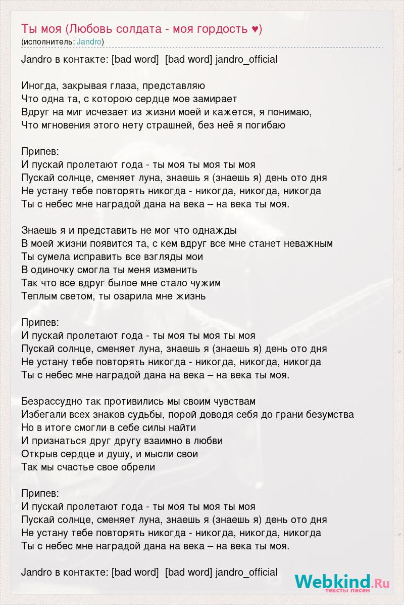 Jandro в контакте: [bad word] [bad word] jandro_official Иногда, закрывая глаза, представляю Что одна та, с которою сердце мое замирает Вдруг на миг исчезает из жизни моей и кажется, я понимаю, Что мгновения этого нету страшней, без неё я погибаю Припев: И пускай пролетают года - ты моя ты моя ты моя Пускай солнце, сменяет луна, знаешь я (знаешь я) день ото дня Не устану тебе повторять никогда - никогда, никогда, никогда Ты с небес мне наградой дана на века – на века ты моя. Знаешь я и представить не мог что однажды В моей жизни появится та, с кем вдруг все мне станет неважным Ты сумела исправить все взгляды мои В одиночку смогла ты меня изменить Так что все вдруг былое мне стало чужим Теплым светом, ты озарила мне жизнь Припев: И пускай пролетают года - ты моя ты моя ты моя Пускай солнце, сменяет луна, знаешь я (знаешь я) день ото дня Не устану тебе повторять никогда - никогда, никогда, никогда Ты с небес мне наградой дана на века – на века ты моя. Безрассудно так противились мы своим чувствам Избегали всех знаков судьбы, порой доводя себя до грани безумства Но в итоге смогли в себе силы найти И признаться друг другу взаимно в любви Открыв сердце и душу, и мысли свои Так мы счастье свое обрели Припев: И пускай пролетают года - ты моя ты моя ты моя Пускай солнце, сменяет луна, знаешь я (знаешь я) день ото дня Не устану тебе повторять никогда - никогда, никогда, никогда Ты с небес мне наградой дана на века – на века ты моя. Jandro в контакте: [bad word] [bad word] jandro_official