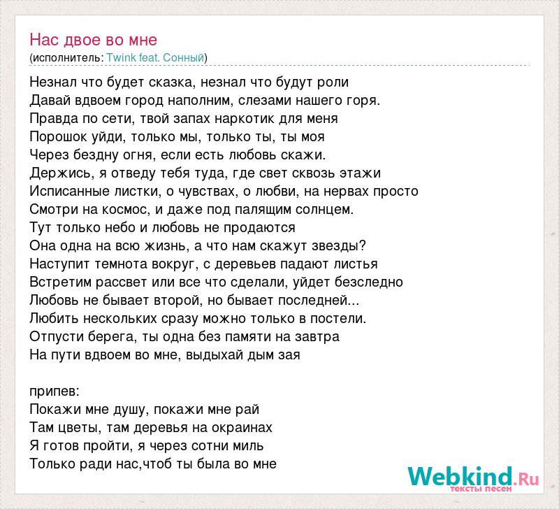 Незнал что будет сказка, незнал что будут роли Давай вдвоем город наполним, слезами нашего горя. Правда по сети, твой запах наркотик для меня Порошок уйди, только мы, только ты, ты моя Через бездну огня, если есть любовь скажи. Держись, я отведу тебя туда, где свет сквозь этажи Исписанные листки, о чувствах, о любви, на нервах просто Смотри на космос, и даже под палящим солнцем. Тут только небо и любовь не продаются Она одна на всю жизнь, а что нам скажут звезды? Наступит темнота вокруг, с деревьев падают листья Встретим рассвет или все что сделали, уйдет безследно Любовь не бывает второй, но бывает последней... Любить нескольких сразу можно только в постели. Отпусти берега, ты одна без памяти на завтра На пути вдвоем во мне, выдыхай дым зая припев: Покажи мне душу, покажи мне рай Там цветы, там деревья на окраинах Я готов пройти, я через сотни миль Только ради нас,чтоб ты была во мне
