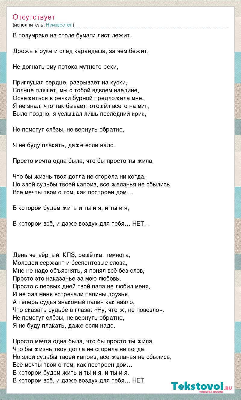 В полумраке на столе бумаги лист лежит, Дрожь в руке и след карандаша, за чем бежит, Не догнать ему потока мутного реки, Приглушая сердце, разрывает на куски, Солнце пляшет, мы с тобой вдвоем наедине, Освежиться в речки бурной предложила мне, Я не знал, что так бывает, отошёл всего на миг, Было поздно, я услышал лишь последний крик, Не помогут слёзы, не вернуть обратно, Я не буду плакать, даже если надо. Просто мечта одна была, что бы просто ты жила, Что бы жизнь твоя дотла не сгорела ни когда, Но злой судьбы твоей каприз, все желанья не сбылись, Все мечты твои о том, как построен дом… В котором будем жить и ты и я, и ты и я, В котором всё, и даже воздух для тебя… НЕТ… День четвёртый, КПЗ, решётка, темнота, Молодой сержант и беспонтовые слова, Мне не надо объяснять, я понял всё без слов, Просто это наказанье за мою любовь, Просто с первых дней твой папа не любил меня, И не раз меня встречали папины друзья, А теперь судья знакомый папин как назло, Что сказать судьбе в глаза: «Ну, что ж, не повезло». Не помогут слёзы, не вернуть обратно, Я не буду плакать, даже если надо. Просто мечта одна была, что бы просто ты жила, Что бы жизнь твоя дотла не сгорела ни когда, Но злой судьбы твоей каприз, все желанья не сбылись, Все мечты твои о том, как построен дом… В котором будем жить и ты и я, и ты и я, В котором всё, и даже воздух для тебя… НЕТ