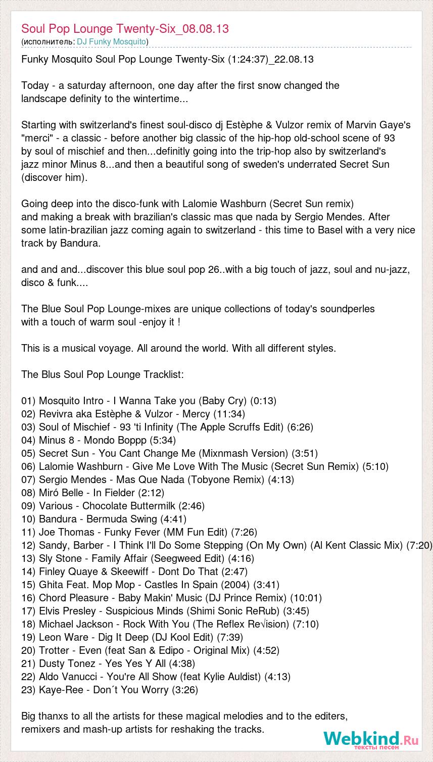 Funky Mosquito Soul Pop Lounge Twenty-Six (1:24:37)_22.08.13 Today - a saturday afternoon, one day after the first snow changed the landscape definity to the wintertime... Starting with switzerland's finest soul-disco dj Estèphe & Vulzor remix of Marvin Gaye's "merci" - a classic - before another big classic of the hip-hop old-school scene of 93 by soul of mischief and then...definitly going into the trip-hop also by switzerland's jazz minor Minus 8...and then a beautiful song of sweden's underrated Secret Sun (discover him). Going deep into the disco-funk with Lalomie Washburn (Secret Sun remix) and making a break with brazilian's classic mas que nada by Sergio Mendes. After some latin-brazilian jazz coming again to switzerland - this time to Basel with a very nice track by Bandura. and and and...discover this blue soul pop 26..with a big touch of jazz, soul and nu-jazz, disco & funk.... The Blue Soul Pop Lounge-mixes are unique collections of today's soundperles with a touch of warm soul -enjoy it ! This is a musical voyage. All around the world. With all different styles. The Blus Soul Pop Lounge Tracklist: 01) Mosquito Intro - I Wanna Take you (Baby Cry) (0:13) 02) Revivra aka Estèphe & Vulzor - Mercy (11:34) 03) Soul of Mischief - 93 'ti Infinity (The Apple Scruffs Edit) (6:26) 04) Minus 8 - Mondo Boppp (5:34) 05) Secret Sun - You Cant Change Me (Mixnmash Version) (3:51) 06) Lalomie Washburn - Give Me Love With The Music (Secret Sun Remix) (5:10) 07) Sergio Mendes - Mas Que Nada (Tobyone Remix) (4:13) 08) Miró Belle - In Fielder (2:12) 09) Various - Chocolate Buttermilk (2:46) 10) Bandura - Bermuda Swing (4:41) 11) Joe Thomas - Funky Fever (MM Fun Edit) (7:26) 12) Sandy, Barber - I Think I'll Do Some Stepping (On My Own) (Al Kent Classic Mix) (7:20) 13) Sly Stone - Family Affair (Seegweed Edit) (4:16) 14) Finley Quaye & Skeewiff - Dont Do That (2:47) 15) Ghita Feat. Mop Mop - Castles In Spain (2004) (3:41) 16) Chord Pleasure - Baby Makin' Music (DJ Prince Remix) (10:01) 17) Elvis Presley - Suspicious Minds (Shimi Sonic ReRub) (3:45) 18) Michael Jackson - Rock With You (The Reflex Re√ision) (7:10) 19) Leon Ware - Dig It Deep (DJ Kool Edit) (7:39) 20) Trotter - Even (feat San & Edipo - Original Mix) (4:52) 21) Dusty Tonez - Yes Yes Y All (4:38) 22) Aldo Vanucci - You're All Show (feat Kylie Auldist) (4:13) 23) Kaye-Ree - Don´t You Worry (3:26) Big thanxs to all the artists for these magical melodies and to the editers, remixers and mash-up artists for reshaking the tracks.