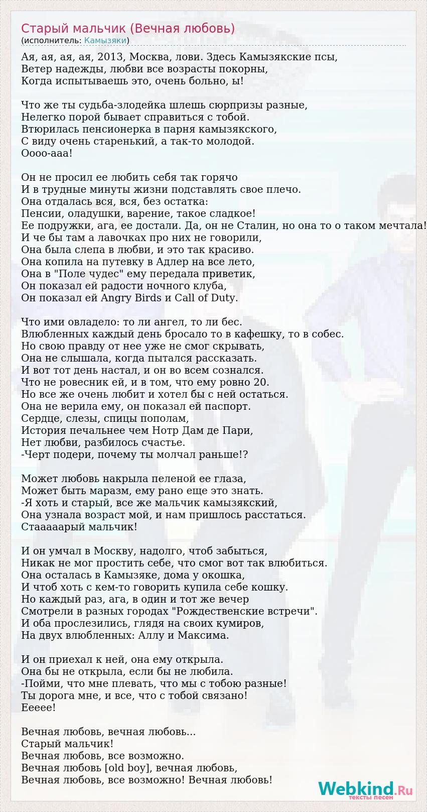 Ая, ая, ая, ая, 2013, Москва, лови. Здесь Камызякские псы, Ветер надежды, любви все возрасты покорны, Когда испытываешь это, очень больно, ы! Что же ты судьба-злодейка шлешь сюрпризы разные, Нелегко порой бывает справиться с тобой. Втюрилась пенсионерка в парня камызякского, С виду очень старенький, а так-то молодой. Оооо-ааа! Он не просил ее любить себя так горячо И в трудные минуты жизни подставлять свое плечо. Она отдалась вся, вся, без остатка: Пенсии, оладушки, варение, такое сладкое! Ее подружки, ага, ее достали. Да, он не Сталин, но она то о таком мечтала! И че бы там а лавочках про них не говорили, Она была слепа в любви, и это так красиво. Она копила на путевку в Адлер на все лето, Она в "Поле чудес" ему передала приветик, Он показал ей радости ночного клуба, Он показал ей Angry Birds и Call of Duty. Что ими овладело: то ли ангел, то ли бес. Влюбленных каждый день бросало то в кафешку, то в собес. Но свою правду от нее уже не смог скрывать, Она не слышала, когда пытался рассказать. И вот тот день настал, и он во всем сознался. Что не ровесник ей, и в том, что ему ровно 20. Но все же очень любит и хотел бы с ней остаться. Она не верила ему, он показал ей паспорт. Сердце, слезы, спицы пополам, История печальнее чем Нотр Дам де Пари, Нет любви, разбилось счастье. -Черт подери, почему ты молчал раньше!? Может любовь накрыла пеленой ее глаза, Может быть маразм, ему рано еще это знать. -Я хоть и старый, все же мальчик камызякский, Она узнала возраст мой, и нам пришлось расстаться. Стааааарый мальчик! И он умчал в Москву, надолго, чтоб забыться, Никак не мог простить себе, что смог вот так влюбиться. Она осталась в Камызяке, дома у окошка, И чтоб хоть с кем-то говорить купила себе кошку. Но каждый раз, ага, в один и тот же вечер Смотрели в разных городах "Рождественские встречи". И оба прослезились, глядя на своих кумиров, На двух влюбленных: Аллу и Максима. И он приехал к ней, она ему открыла. Она бы не открыла, если бы не любила. -Пойми, что мне плевать, что мы с тобою разные! Ты дорога мне, и все, что с тобой связано! Еееее! Вечная любовь, вечная любовь... Старый мальчик! Вечная любовь, все возможно. Вечная любовь [old boy], вечная любовь, Вечная любовь, все возможно! Вечная любовь!