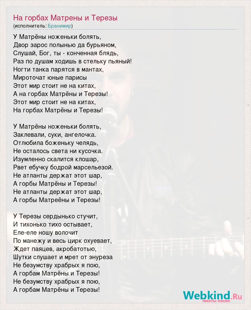 У Матрёны ноженьки болять, Двор зарос полынью да бурьяном, Слушай, Бог, ты - конченная блядь, Раз по душам ходишь в стельку пьяный! Ногти танка парятся в мантах, Мироточат юные парисы Этот мир стоит не на китах, А на горбах Матрёны и Терезы! Этот мир стоит не на китах, На горбах Матрёны и Терезы! У Матрёны ноженьки болять, Заклевали, суки, ангелочка. Отлюбила боженьку челядь, Не осталось света ни кусочка. Изумленно скалится клошар, Рвет ебучку бодрой марсельезой. Не атланты держат этот шар, А горбы Матрёны и Терезы! Не атланты держат этот шар, А горбы Матреёны и Терезы! У Терезы сердынько стучит, И тихонько тихо остывает, Еле-еле ношу волочит По манежу и весь цирк охуевает, Ждет паяцев, акробатотью, Шутки слушает и мрет от энуреза Не безумству храбрых я пою, А горбам Матрёны и Терезы! Не безумству храбрых я пою, А горбам Матрёны и Терезы!