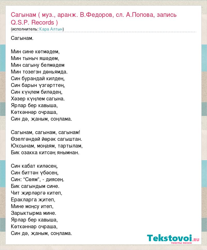 Сагынам. Мин сине көтмәдем, Мин тыныч яшәдем, Мин сагыну белмәдем Мин тозегэн дөньямда. Син бурандай килдең, Син барын үзгәрттең, Син күңлем биләдең, Хәзер күңлем сагына. Ярлар бер кавыша, Көткәннәр очраша, Син дә, җаным, соңлама. Сагынам, сагынам, сагынам! Өзелгәндәй йөрәк сагыштан. Юксынам, моңаям, тартылам, Бик озакка китсәң янымнан. Син кабат киләсең, Син биттән үбәсең, Син: “Сөям”, - диясең. Бик сагындым сине. Чит җирләргә китеп, Еракларга җитеп, Мине моңсу итеп, Зарыктырма мине. Ярлар бер кавыша, Көткәннәр очраша, Син дә, җаным, соңлама.