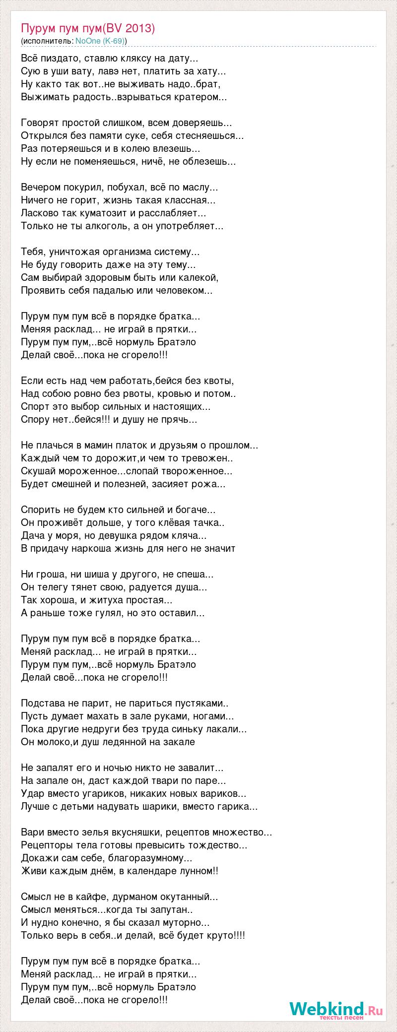 Всё пиздато, ставлю кляксу на дату... Сую в уши вату, лавэ нет, платить за хату... Ну както так вот..не выживать надо..брат, Выжимать радость..взрываться кратером... Говорят простой слишком, всем доверяешь... Открылся без памяти суке, себя стесняешься... Раз потеряешься и в колею влезешь... Ну если не поменяешься, ничё, не облезешь... Вечером покурил, побухал, всё по маслу... Ничего не горит, жизнь такая классная... Ласково так куматозит и расслабляет... Только не ты алкоголь, а он употребляет... Тебя, уничтожая организма систему... Не буду говорить даже на эту тему... Сам выбирай здоровым быть или калекой, Проявить себя падалью или человеком... Пурум пум пум всё в порядке братка... Меняя расклад... не играй в прятки... Пурум пум пум,..всё нормуль Братэло Делай своё...пока не сгорело!!! Если есть над чем работать,бейся без квоты, Над собою ровно без рвоты, кровью и потом.. Спорт это выбор сильных и настоящих... Спору нет..бейся!!! и душу не прячь... Не плачься в мамин платок и друзьям о прошлом... Каждый чем то дорожит,и чем то тревожен.. Скушай мороженное...слопай твороженное... Будет смешней и полезней, засияет рожа... Спорить не будем кто сильней и богаче... Он проживёт дольше, у того клёвая тачка.. Дача у моря, но девушка рядом кляча... В придачу наркоша жизнь для него не значит Ни гроша, ни шиша у другого, не спеша... Он телегу тянет свою, радуется душа... Так хороша, и житуха простая... А раньше тоже гулял, но это оставил... Пурум пум пум всё в порядке братка... Меняй расклад... не играй в прятки... Пурум пум пум,..всё нормуль Братэло Делай своё...пока не сгорело!!! Подстава не парит, не париться пустяками.. Пусть думает махать в зале руками, ногами... Пока другие недруги без труда синьку лакали... Он молоко,и душ ледянной на закале Не запалят его и ночью никто не завалит... На запале он, даст каждой твари по паре... Удар вместо угариков, никаких новых вариков... Лучше с детьми надувать шарики, вместо гарика... Вари вместо зелья вкусняшки, рецептов множество... Рецепторы тела готовы превысить тождество... Докажи сам себе, благоразумному... Живи каждым днём, в календаре лунном!! Смысл не в кайфе, дурманом окутанный... Смысл меняться...когда ты запутан.. И нудно конечно, я бы сказал муторно... Только верь в себя..и делай, всё будет круто!!!! Пурум пум пум всё в порядке братка... Меняй расклад... не играй в прятки... Пурум пум пум,..всё нормуль Братэло Делай своё...пока не сгорело!!!