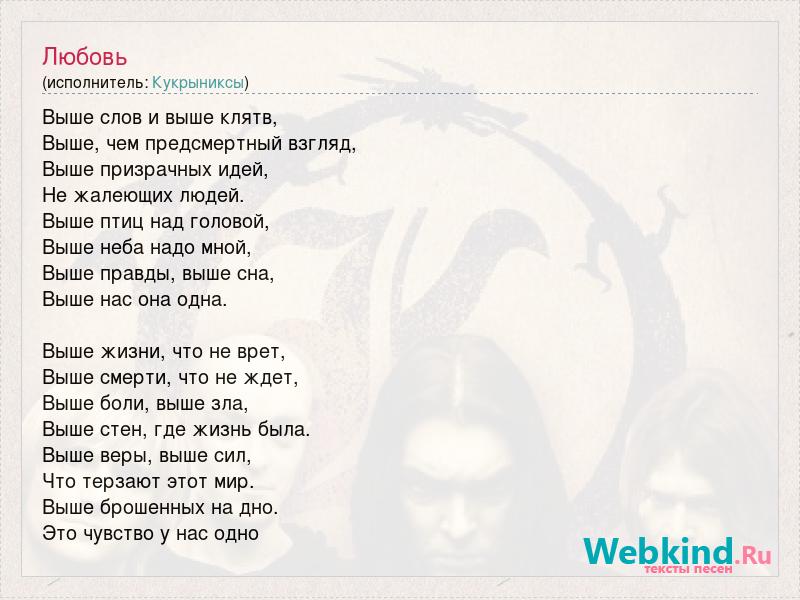 Выше слов и выше клятв, Выше, чем предсмертный взгляд, Выше призрачных идей, Не жалеющих людей. Выше птиц над головой, Выше неба надо мной, Выше правды, выше сна, Выше нас она одна. Выше жизни, что не врет, Выше смерти, что не ждет, Выше боли, выше зла, Выше стен, где жизнь была. Выше веры, выше сил, Что терзают этот мир. Выше брошенных на дно. Это чувство у нас одно