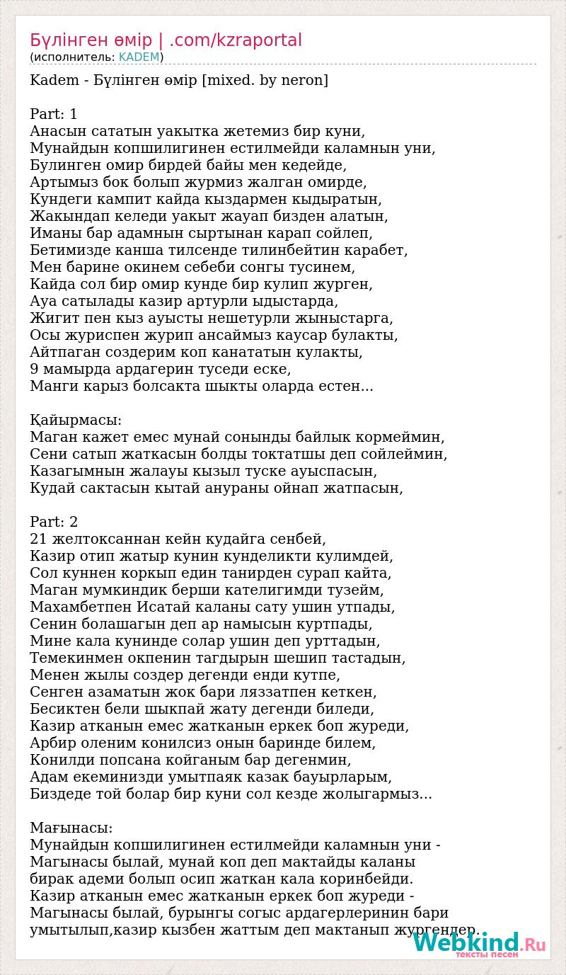 Kadem - Бүлінген өмір [mixed. by neron] Part: 1 Анасын сататын уакытка жетемиз бир куни, Мунайдын копшилигинен естилмейди каламнын уни, Булинген омир бирдей байы мен кедейде, Артымыз бок болып журмиз жалган омирде, Кундеги кампит кайда кыздармен кыдыратын, Жакындап келеди уакыт жауап бизден алатын, Иманы бар адамнын сыртынан карап сойлеп, Бетимизде канша тилсенде тилинбейтин карабет, Мен барине окинем себеби сонгы тусинем, Кайда сол бир омир кунде бир кулип журген, Ауа сатылады казир артурли ыдыстарда, Жигит пен кыз ауысты нешетурли жыныстарга, Осы журиспен журип ансаймыз каусар булакты, Айтпаган создерим коп канататын кулакты, 9 мамырда ардагерин туседи еске, Манги карыз болсакта шыкты оларда естен... Қайырмасы: Маган кажет емес мунай сонынды байлык кормеймин, Сени сатып жаткасын болды токтатшы деп сойлеймин, Казагымнын жалауы кызыл туске ауыспасын, Кудай сактасын кытай анураны ойнап жатпасын, Part: 2 21 желтоксаннан кейн кудайга сенбей, Казир отип жатыр кунин кунделикти кулимдей, Сол куннен коркып един танирден сурап кайта, Маган мумкиндик берши кателигимди тузейм, Махамбетпен Исатай каланы сату ушин утпады, Сенин болашагын деп ар намысын куртпады, Мине кала кунинде солар ушин деп урттадын, Темекинмен окпенин тагдырын шешип тастадын, Менен жылы создер дегенди енди кутпе, Сенген азаматын жок бари ляззатпен кеткен, Бесиктен бели шыкпай жату дегенди биледи, Казир атканын емес жатканын еркек боп журеди, Арбир оленим конилсиз онын баринде билем, Конилди попсана койганым бар дегенмин, Адам екеминизди умытпаяк казак бауырларым, Биздеде той болар бир куни сол кезде жолыгармыз... Мағынасы: Мунайдын копшилигинен естилмейди каламнын уни - Магынасы былай, мунай коп деп мактайды каланы бирак адеми болып осип жаткан кала коринбейди. Казир атканын емес жатканын еркек боп журеди - Магынасы былай, бурынгы согыс ардагерлеринин бари умытылып,казир кызбен жаттым деп мактанып жургендер.