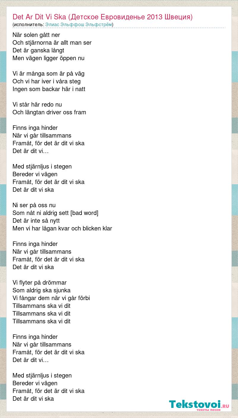 А как ты думаешь, о чем песня "Det Ar Dit Vi Ska (Детское Евровиденье 2013 Швеция)" ?