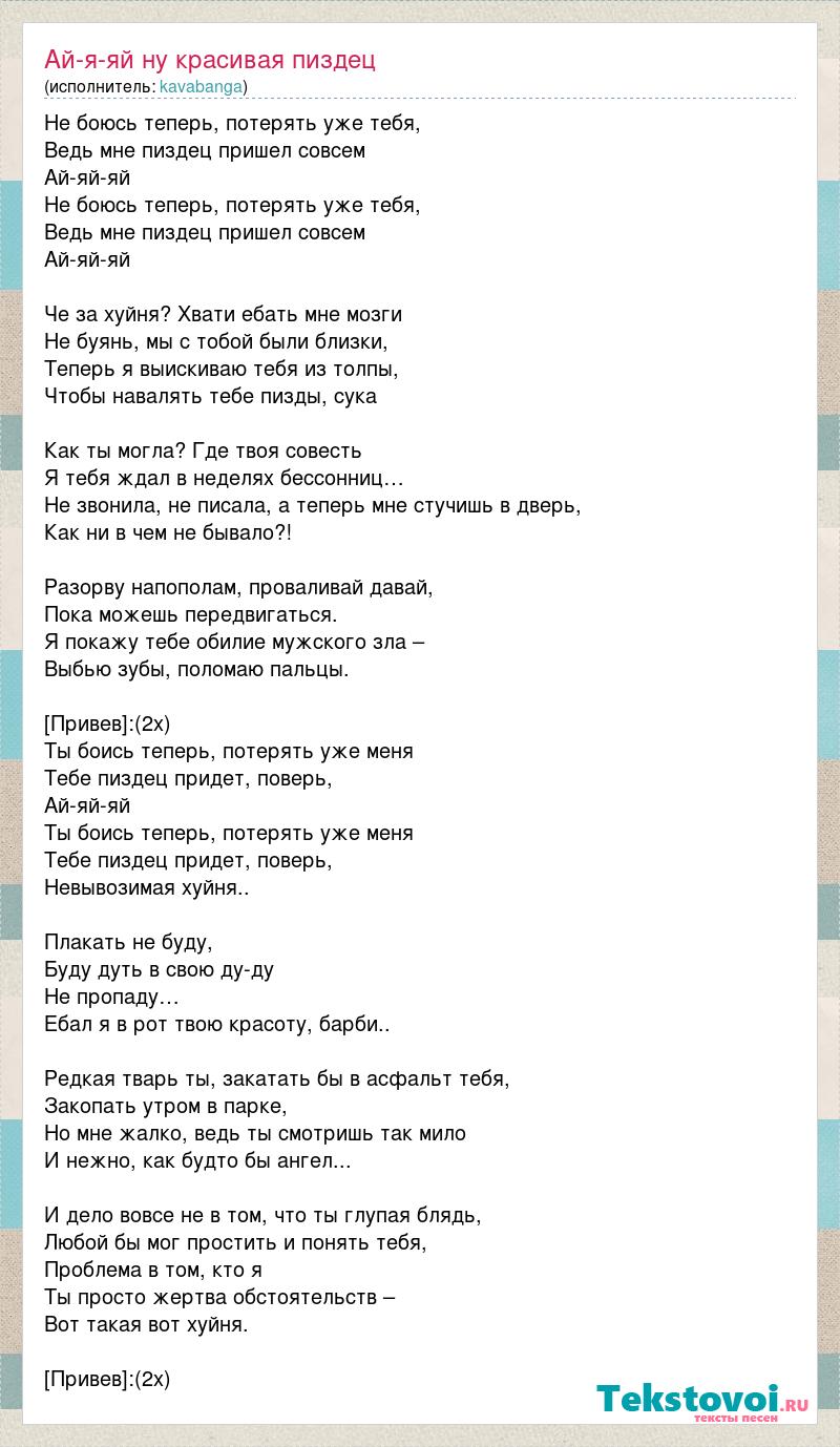 Не боюсь теперь, потерять уже тебя, Ведь мне пиздец пришел совсем Ай-яй-яй Не боюсь теперь, потерять уже тебя, Ведь мне пиздец пришел совсем Ай-яй-яй Че за хуйня? Хвати ебать мне мозги Не буянь, мы с тобой были близки, Теперь я выискиваю тебя из толпы, Чтобы навалять тебе пизды, сука Как ты могла? Где твоя совесть Я тебя ждал в неделях бессонниц… Не звонила, не писала, а теперь мне стучишь в дверь, Как ни в чем не бывало?! Разорву напополам, проваливай давай, Пока можешь передвигаться. Я покажу тебе обилие мужского зла – Выбью зубы, поломаю пальцы. [Привев]:(2х) Ты боись теперь, потерять уже меня Тебе пиздец придет, поверь, Ай-яй-яй Ты боись теперь, потерять уже меня Тебе пиздец придет, поверь, Невывозимая хуйня.. Плакать не буду, Буду дуть в свою ду-ду Не пропаду… Ебал я в рот твою красоту, барби.. Редкая тварь ты, закатать бы в асфальт тебя, Закопать утром в парке, Но мне жалко, ведь ты смотришь так мило И нежно, как будто бы ангел... И дело вовсе не в том, что ты глупая блядь, Любой бы мог простить и понять тебя, Проблема в том, кто я Ты просто жертва обстоятельств – Вот такая вот хуйня. [Привев]:(2х)