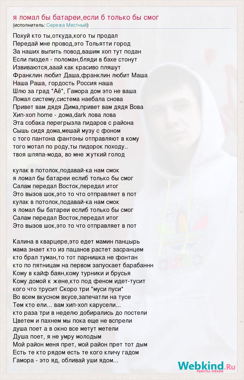 Похуй кто ты,откуда,кого ты продал Передай мне провод,это Тольятти город За наших выпить повод,вашим хоп тут подан Если пиздел - поломан,бляди в бэхе стонут Извиваются,ааай как красиво пляшут Франклин любит Даша,франклин любит Маша Наша Раша, гордость Россия наша Шлю за град *Аё*, Гамора дом это не ваша Ломал систему,система наебала снова Привет вам дядя Дима,привет вам дядя Вова Хип-хоп homе - дома,dark лова лова Эта собака перегрызла пидаров с района Сышь сидя дома,мешай музу с фоном с того пантона фантоны отправляют в кому того мотал по роду,ты пидорок походу.. твоя шляпа-мода, во мне жуткий голод кулак в потолок,подавай-ка нам смок я ломал бы батареи еслиб только бы смог Салам передал Восток,передал итог Это вызов шок,это то что отправляет в пот кулак в потолок,подавай-ка нам смок я ломал бы батареи еслиб только бы смог Салам передал Восток,передал итог Это вызов шок,это то что отправляет в пот Калина в кварцере,это едет мамин панцырь мама знает кто из пацанов растет засранцем кто брал туман,то тот парнишка не фонтан кто по пятницам на первом запускает барабаннн Кому в кайф баян,кому турники и брусья Кому домой к жене,кто под феном идет-тусит кого что трусит Скоро три *муси пуси* Во всем вкусном вкусе,запечатли на тусе Тем кто ели... вам хип-хоп карусели... кто раза три в неделю добирались до постели Цветем и пахнем мы пока еще не вспрели душа поет а в окно все метут метели Душа поет, я не умру молодым Мой район меня прет, мой район прет тот дым Есть те кто рядом есть те кого кличу гадом Гамора - это яд, обливай уши ядом...