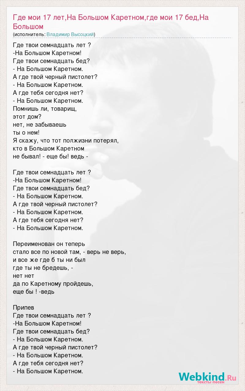 Где твои семнадцать лет ? -На Большом Каретном! Где твои семнадцать бед? - На Большом Каретном. А где твой черный пистолет? - На Большом Каретном. А где тебя сегодня нет? - На Большом Каретном. Помнишь ли, товарищ, этот дом? нет, не забываешь ты о нем! Я скажу, что тот полжизни потерял, кто в Большом Каретном не бывал! - еще бы! ведь - Где твои семнадцать лет ? -На Большом Каретном! Где твои семнадцать бед? - На Большом Каретном. А где твой черный пистолет? - На Большом Каретном. А где тебя сегодня нет? - На Большом Каретном. Переименован он теперь стало все по новой там, - верь не верь, и все же где б ты ни был где ты не бредешь, - нет нет да по Каретному пройдешь, еще бы ! -ведь Припев Где твои семнадцать лет ? -На Большом Каретном! Где твои семнадцать бед? - На Большом Каретном. А где твой черный пистолет? - На Большом Каретном. А где тебя сегодня нет? - На Большом Каретном.