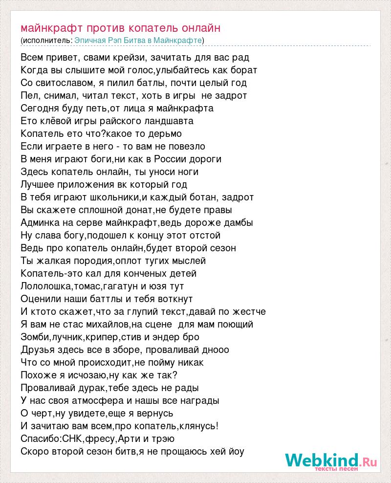 Всем привет, свами крейзи, зачитать для вас рад Когда вы слышите мой голос,улыбайтесь как борат Со свитославом, я пилил батлы, почти целый год Пел, снимал, читал текст, хоть в игры не задрот Сегодня буду петь,от лица я майнкрафта Ето клёвой игры райского ландшавта Копатель ето что?какое то дерьмо Если играете в него - то вам не повезло В меня играют боги,ни как в России дороги Здесь копатель онлайн, ты уноси ноги Лучшее приложения вк который год В тебя играют школьники,и каждый ботан, задрот Вы скажете сплошной донат,не будете правы Админка на серве майнкрафт,ведь дороже дамбы Ну слава богу,подошел к концу этот отстой Ведь про копатель онлайн,будет второй сезон Ты жалкая породия,оплот тугих мыслей Копатель-это кал для конченых детей Лололошка,томас,гагатун и юзя тут Оценили наши баттлы и тебя воткнут И ктото скажет,что за глупий текст,давай по жестче Я вам не стас михайлов,на сцене для мам поющий Зомби,лучник,крипер,стив и эндер бро Друзья здесь все в зборе, проваливай днооо Что со мной происходит,не пойму никак Похоже я исчозаю,ну как же так? Проваливай дурак,тебе здесь не рады У нас своя атмосфера и нашы все награды О черт,ну увидете,еще я вернусь И зачитаю вам всем,про копатель,клянусь! Спасибо:СНК,фресу,Арти и трэю Скоро второй сезон битв,я не прощаюсь хей йоу